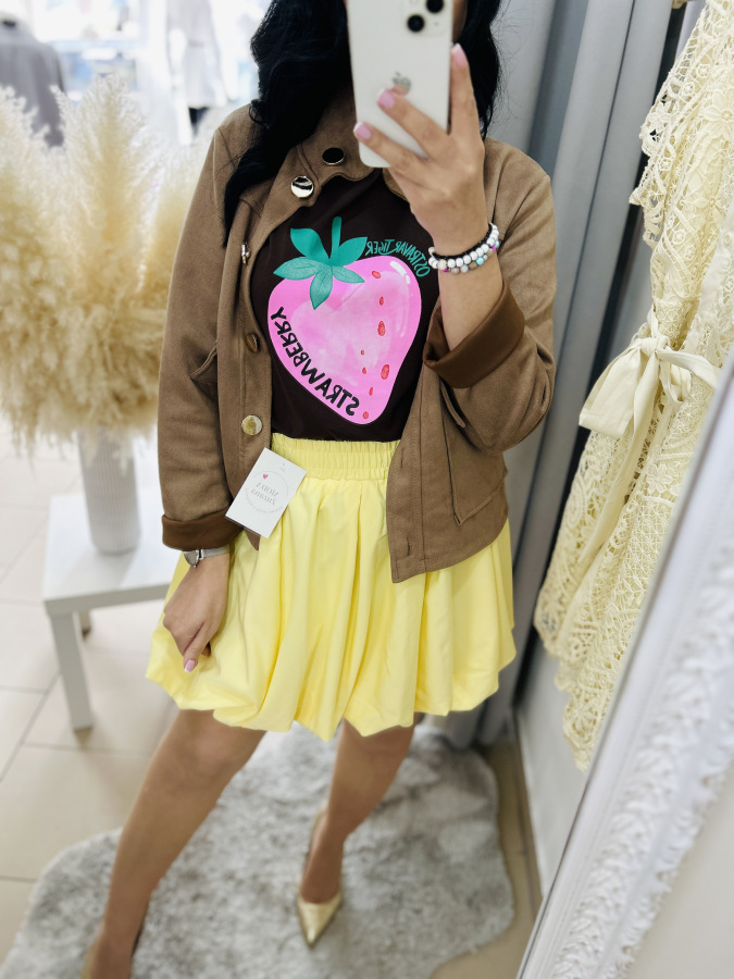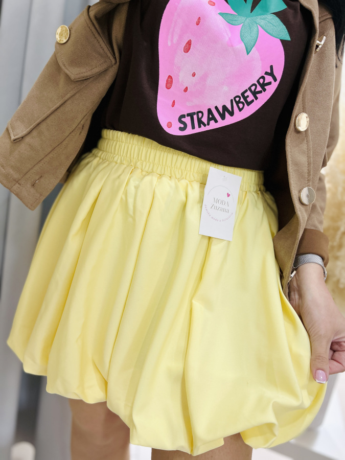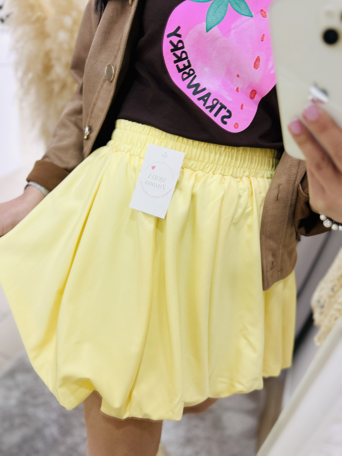 Suknička v žltej farbe balónového strihu s elastickou gumou v páse. Vhodná k elegantným, ale aj športovým outfitom.