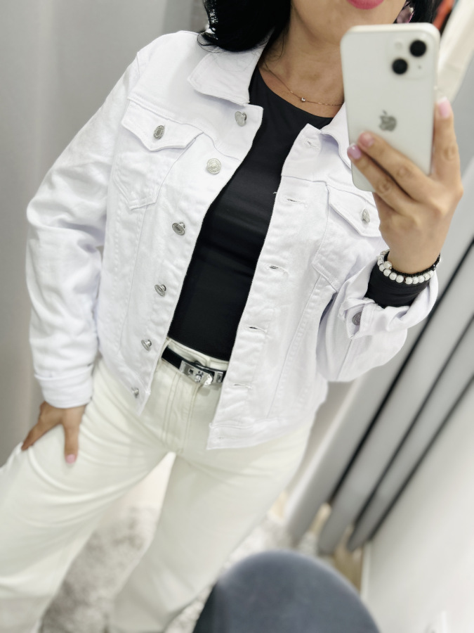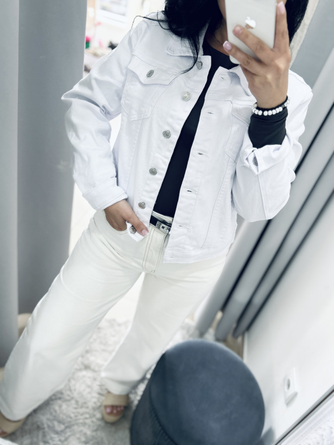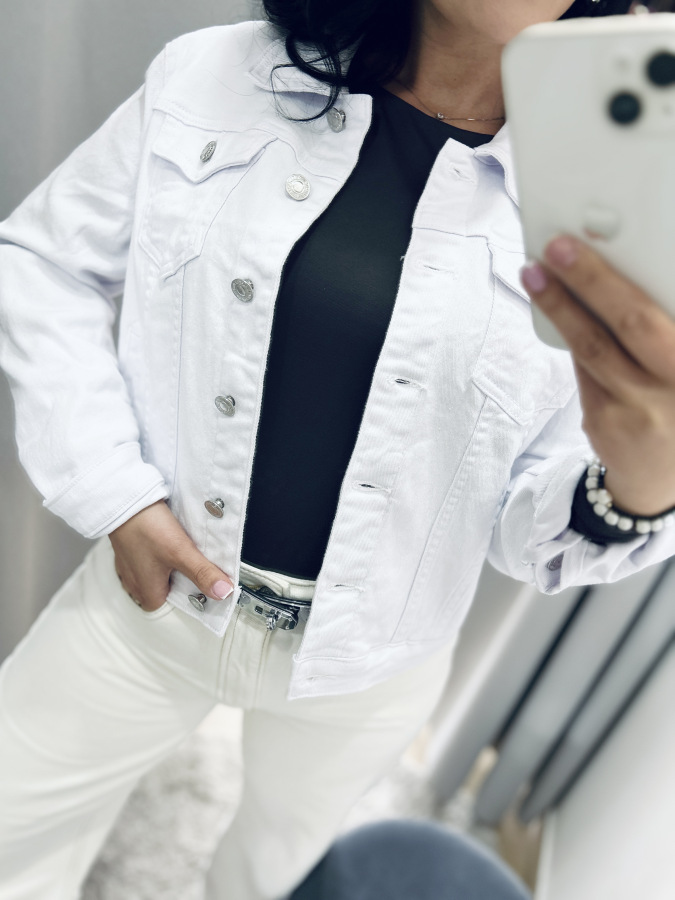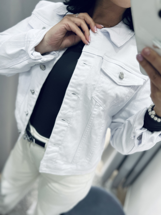 Štýlová rifľová bundička v bielej farbe so zapínaním na gombíky. Predné náprsné vrecká, dlhé rukávy, golierik.