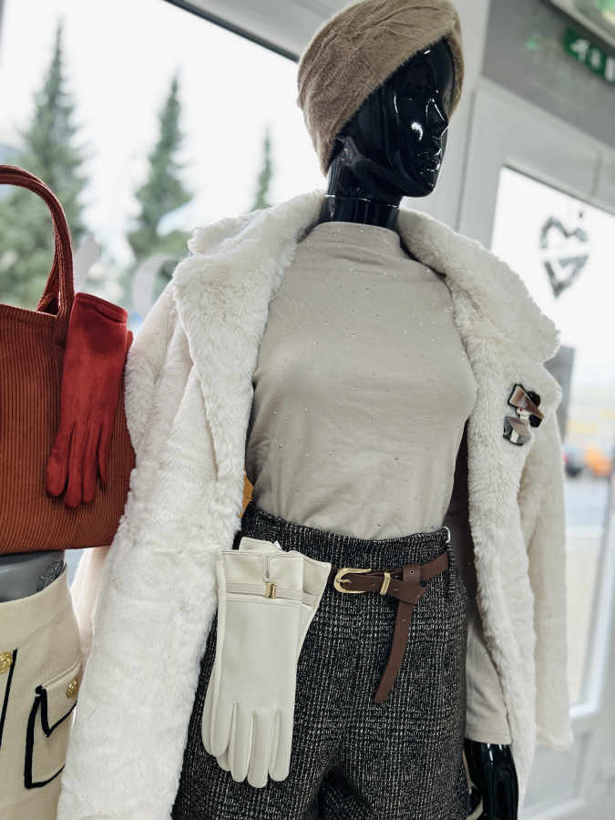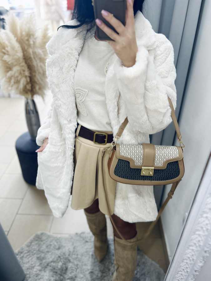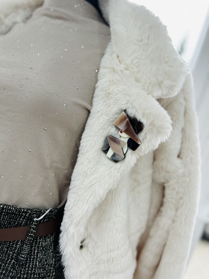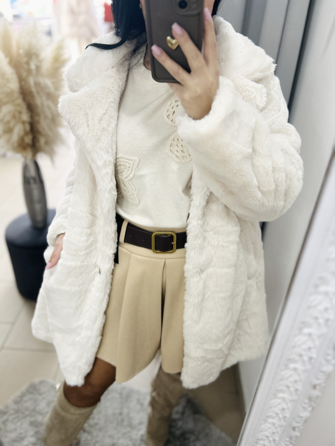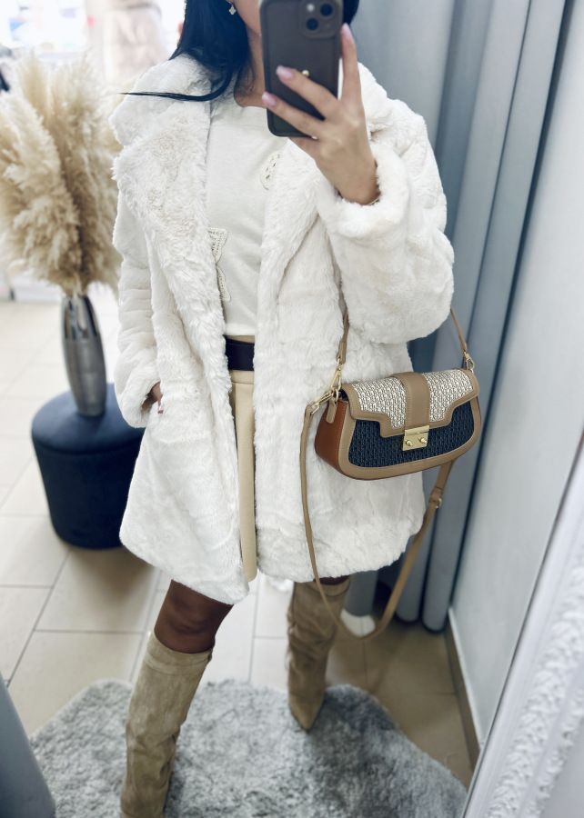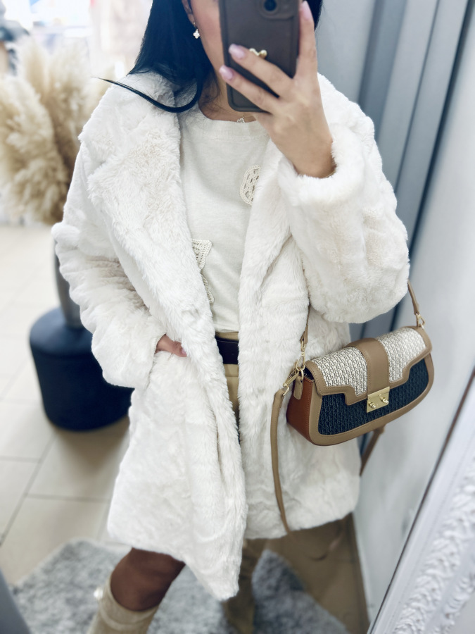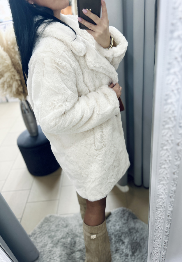 Tento štýlový biely kabát je krásne mäkučký a príjemný na dotyk. Pôsobí luxusne, zároveň je pohodlný a vhodný na každodenné nosenie aj výnimočné príležitosti.