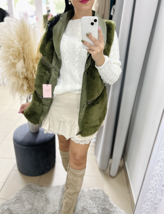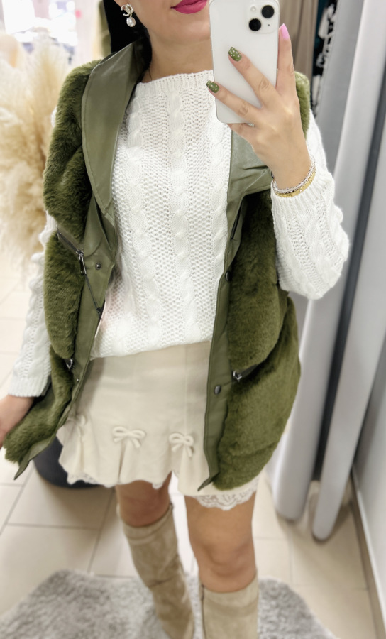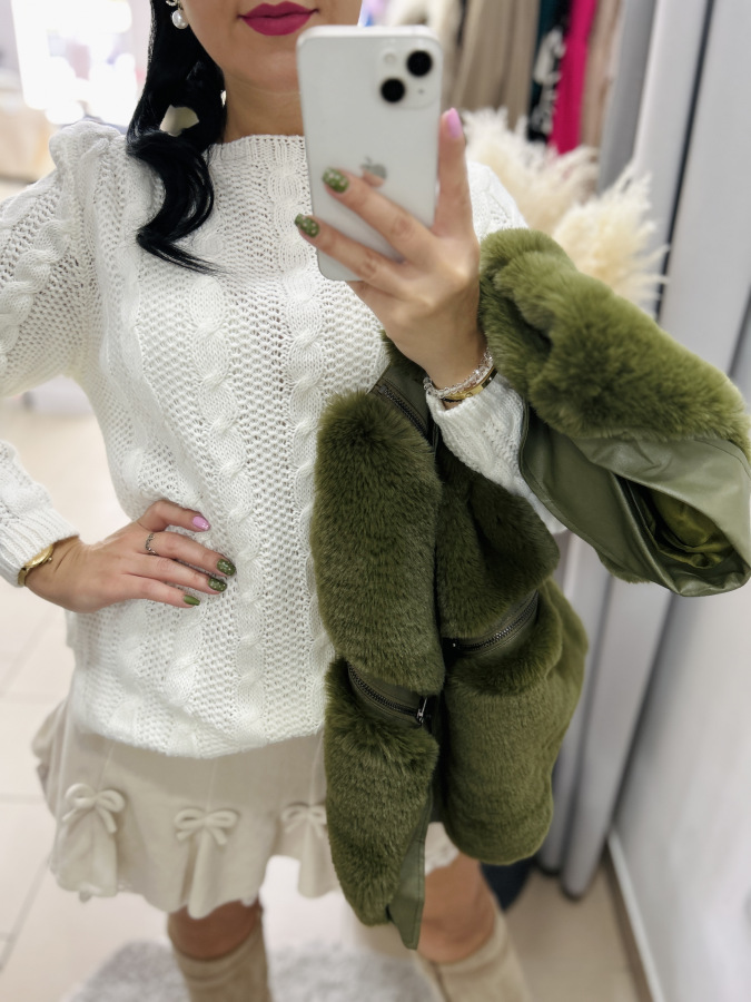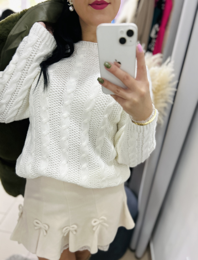 Pohodlný, mäkký a nadčasový! Tento krásny biely sveter s výrazným pleteným vzorom (typ "copánkový úplet") je ideálny k sukniam aj nohaviciam. Má jemne oversize strih, ktorý sa prispôsobí postave a poskytuje maximálne pohodlie. Skvelo sa hodí na každodenné nosenie aj na štýlové jesenné či zimné outfity.