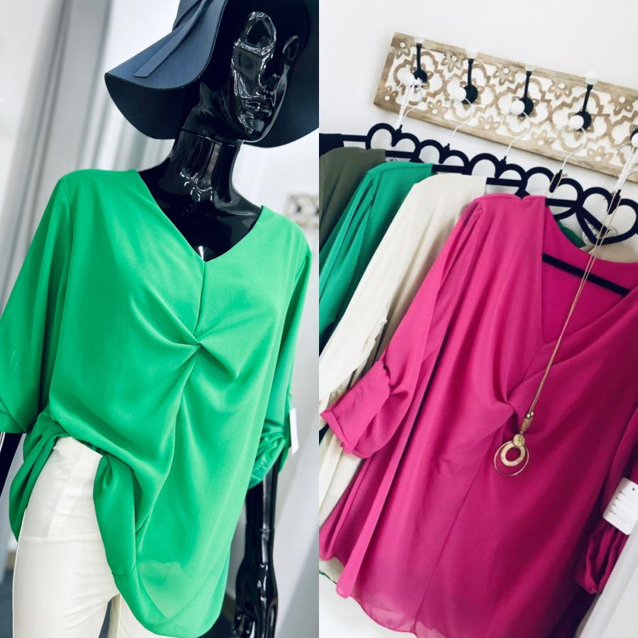 Blúzka s nazberanou látkou v prednej časti, dlhým rukávom, ktorý je možné nosiť aj ako 3/4.