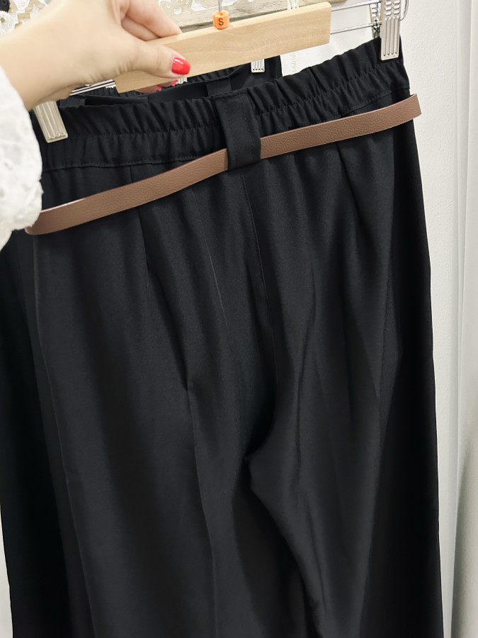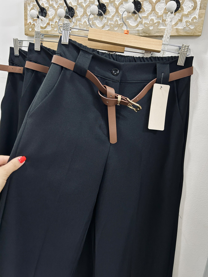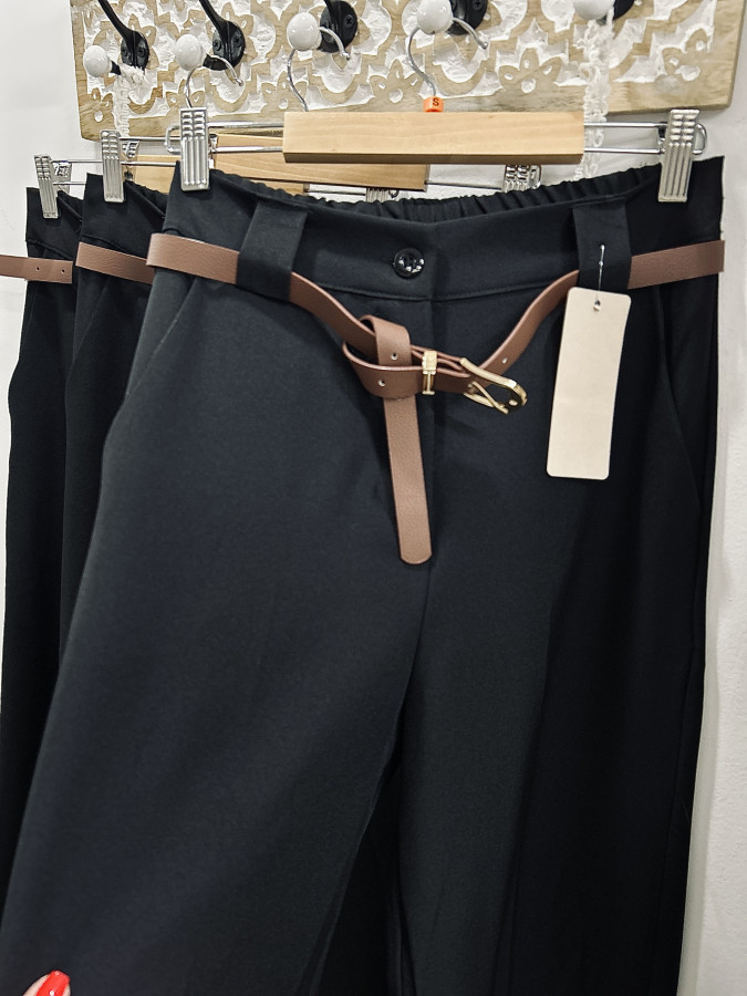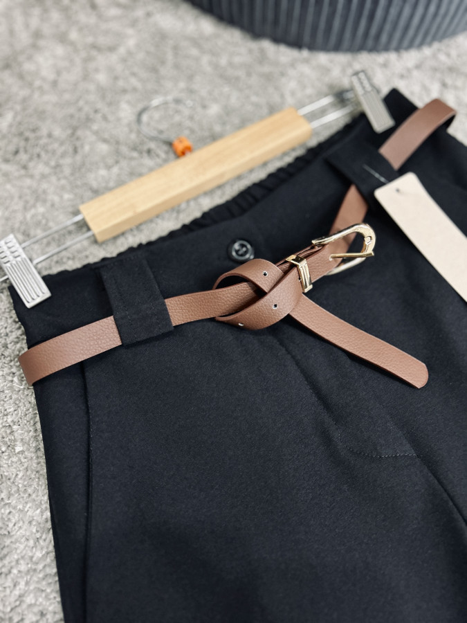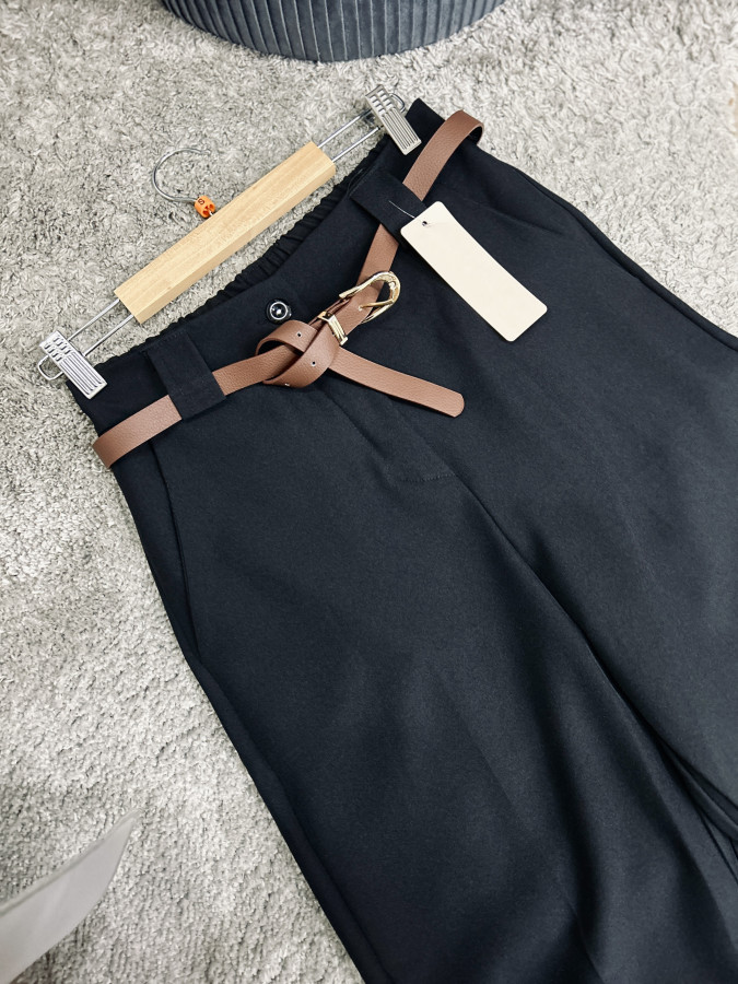 Čierne elegantné nohavice s vyšším pásom, zapínaním na zips a gombík, bočnými vreckami a hnedým opaskom. Nohavice majú na zadnej strane elastickú gumu, sú zvonového strihu. Veľkosti zodpovedajú klasickému číslovaniu.
