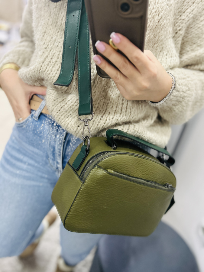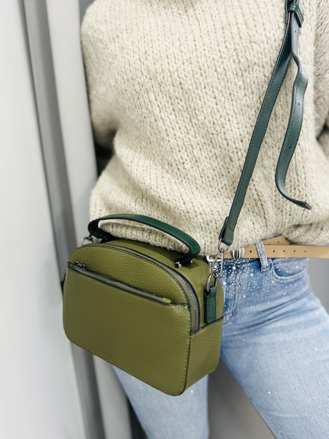 Crossbody kabelka v zelenej farbe s dlhým nastaviteľným ramienkom. Kabelka má zapínanie na 2 zipsy.