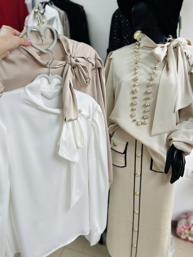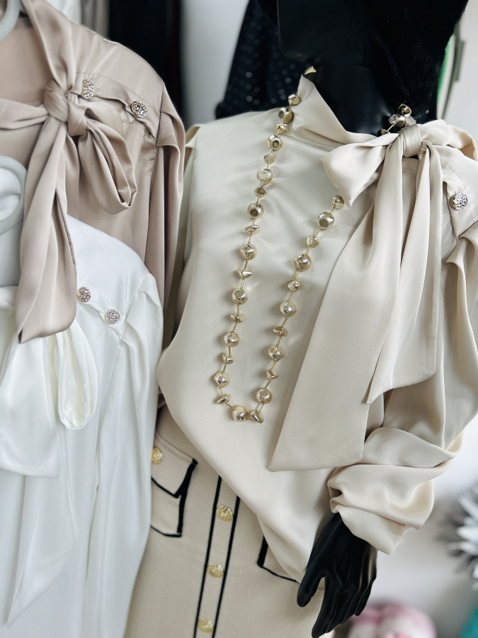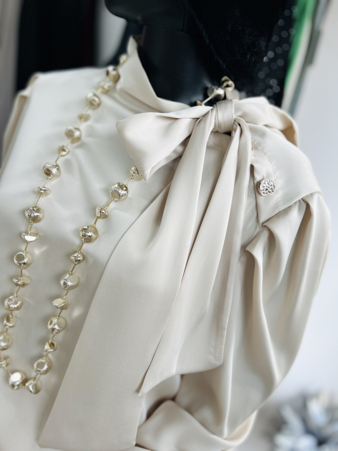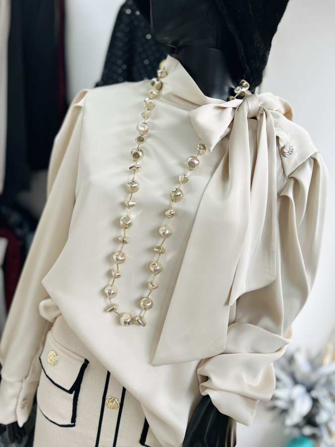 Elegantná blúzka s dlhým rukávom je dokonalým kúskom pre ženy, ktoré milujú nadčasový štýl a jemné detaily. Blúzka zaujme viazaním na efektnú mašľu pri krku, ktoré dodáva outfitu ženskosť a noblesu. Ozdobné zlaté gombíky pôsobia luxusne a krásne dopĺňajú celkový elegantný vzhľad.