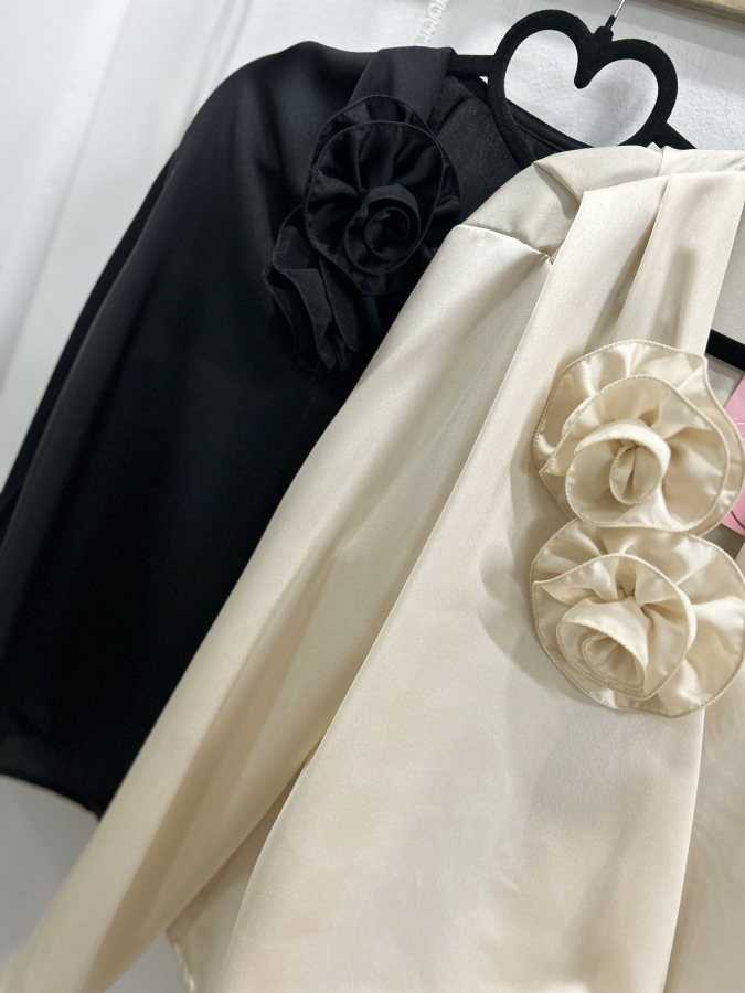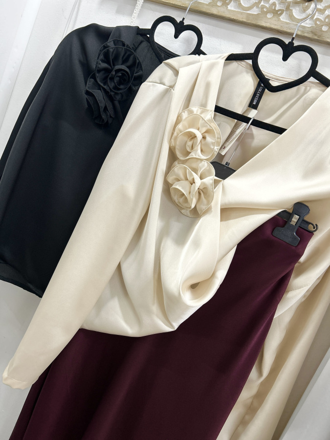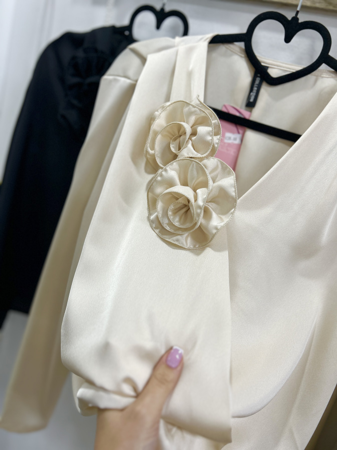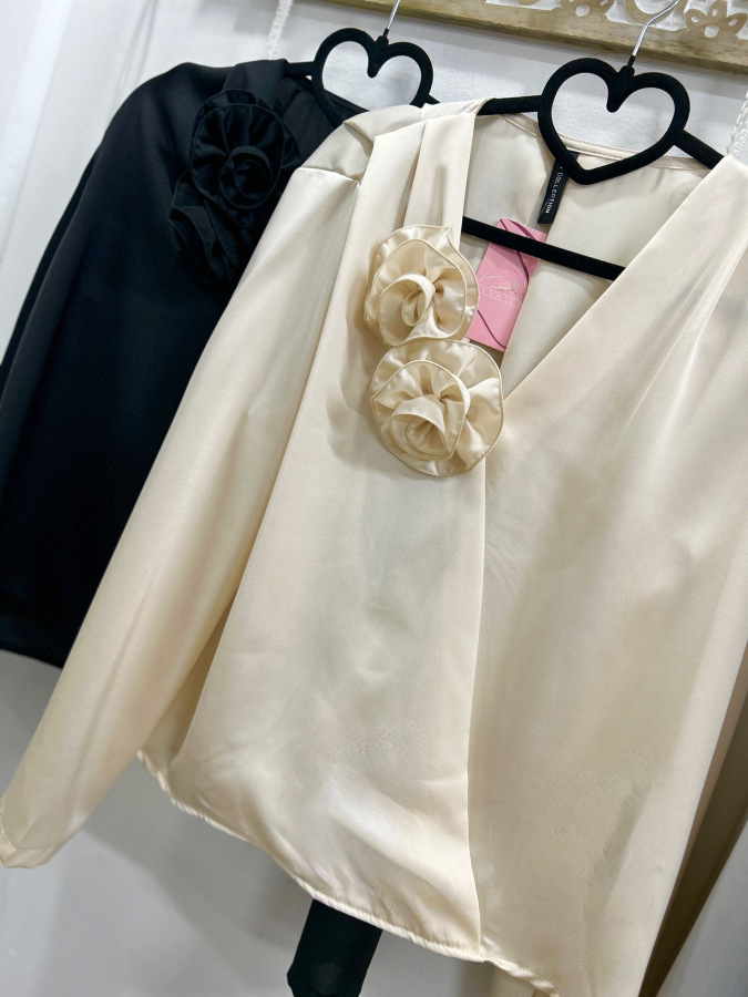 Elegantná saténová blúzka s dlhými rukávmi, véčkovým výstrihom a brošňou v tvare kvetu. Brošňa je odnímateľná.