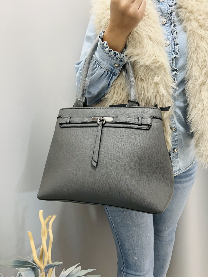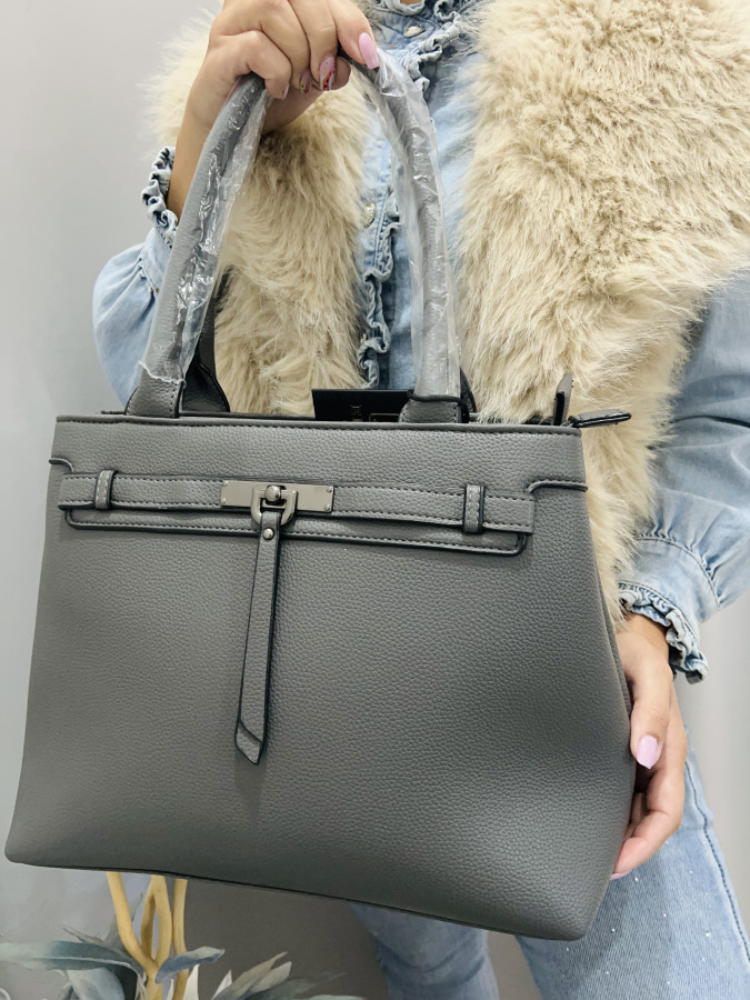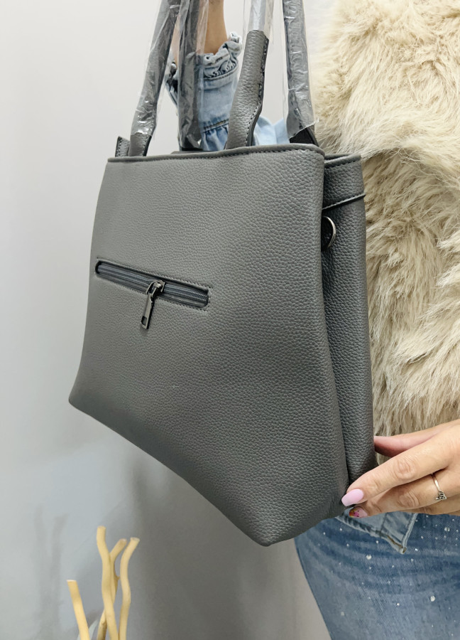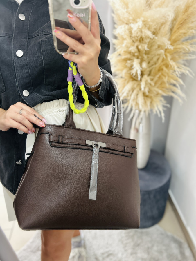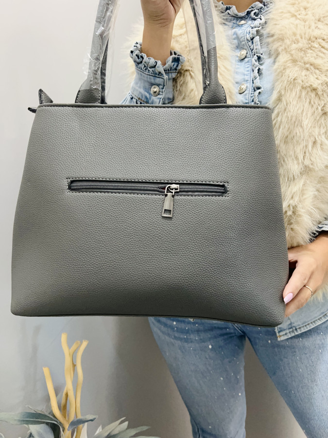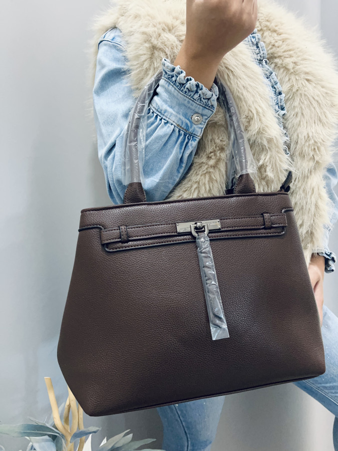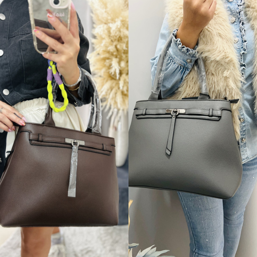 Koženková kabelka s dvomi krátkymi putkami a s jedným dlhým, nastaviteľným ramienkom, ktoré je možné odopnúť. Kabelka je ozdobená príveskom. Kabelka má 2 samostatné priehradky so zapínaním na zipsy. Rozmery: 37 cm x 26 cm
