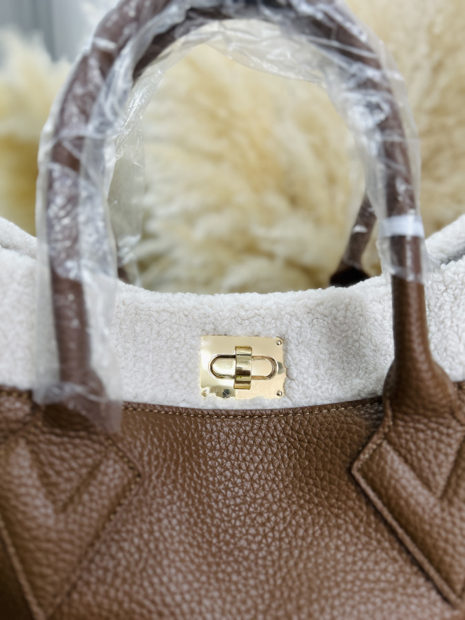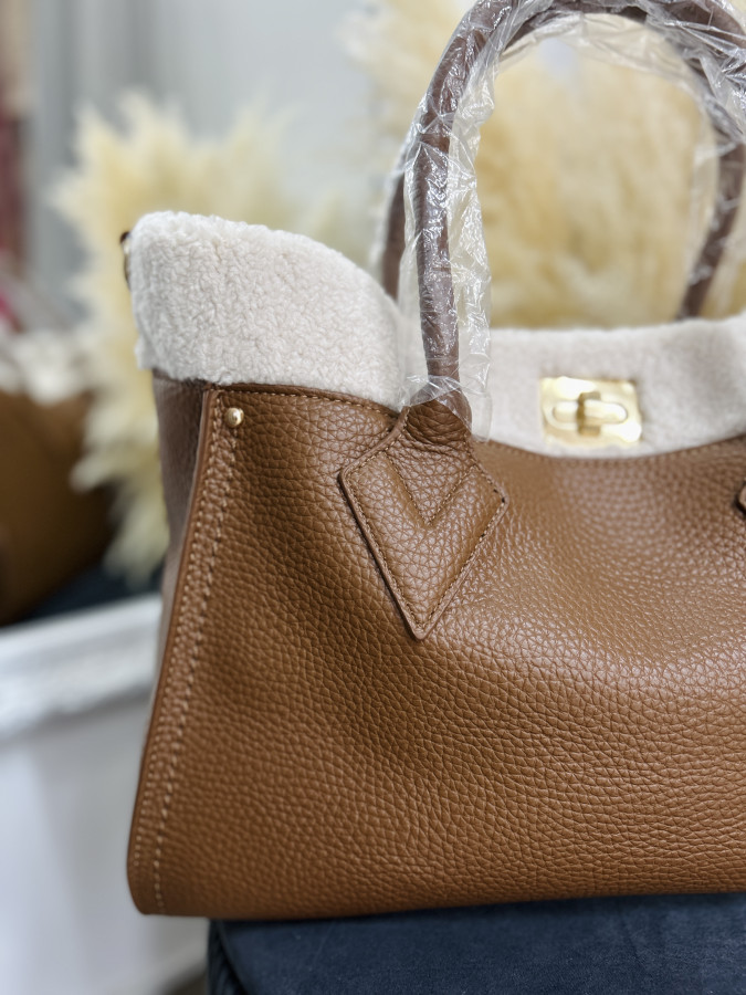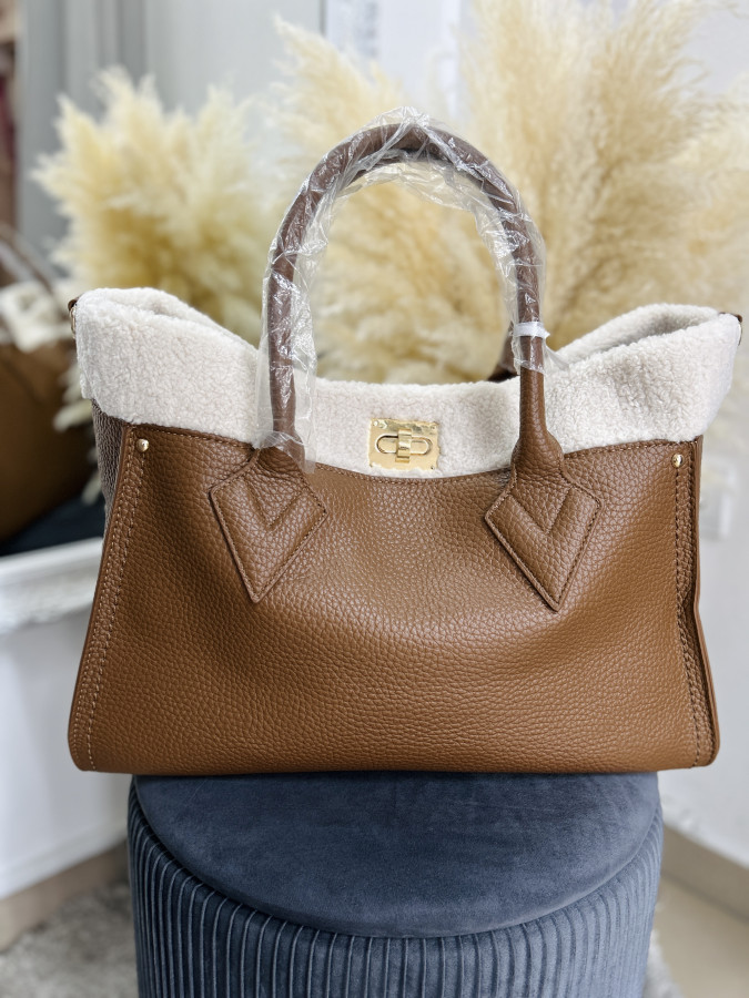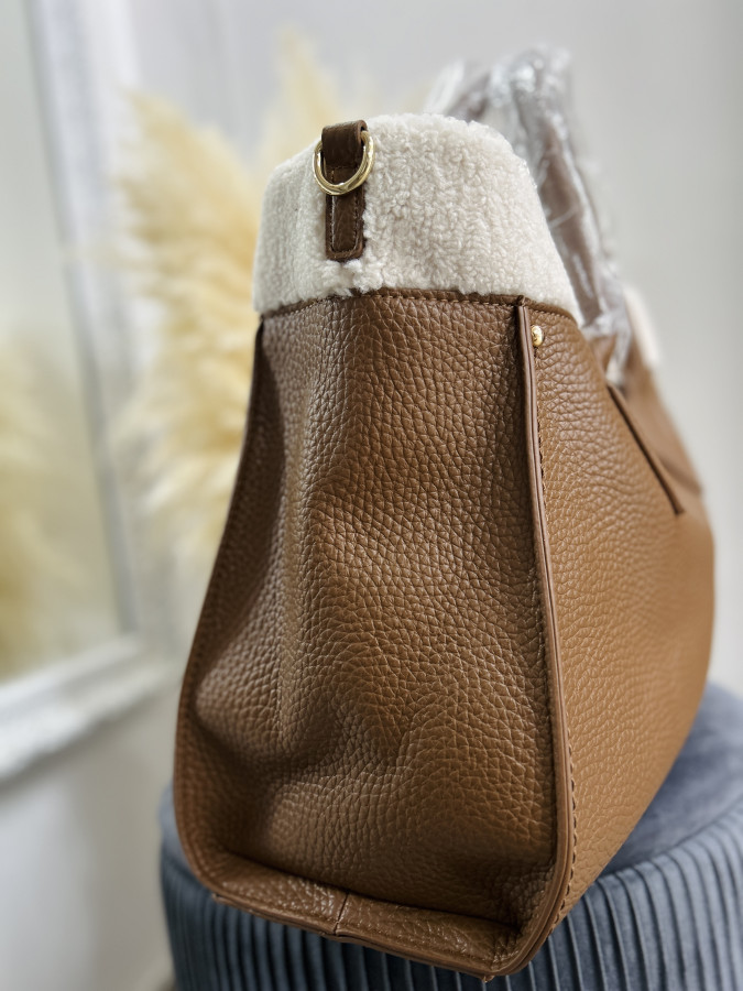 Väčšia koženková kabelka v camel farbe zdobená barančekom v smotanovej farbe. Kabelka má 2 krátke putká, súčasťou je aj dlhé crossbody ramienko.Zapínanie je na kovový cvok typu ,,motýlik".