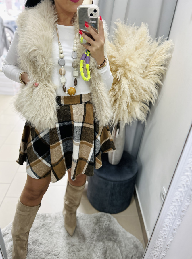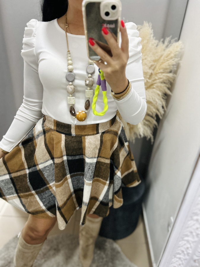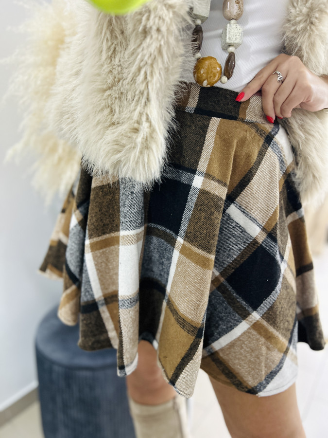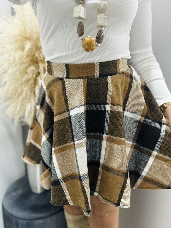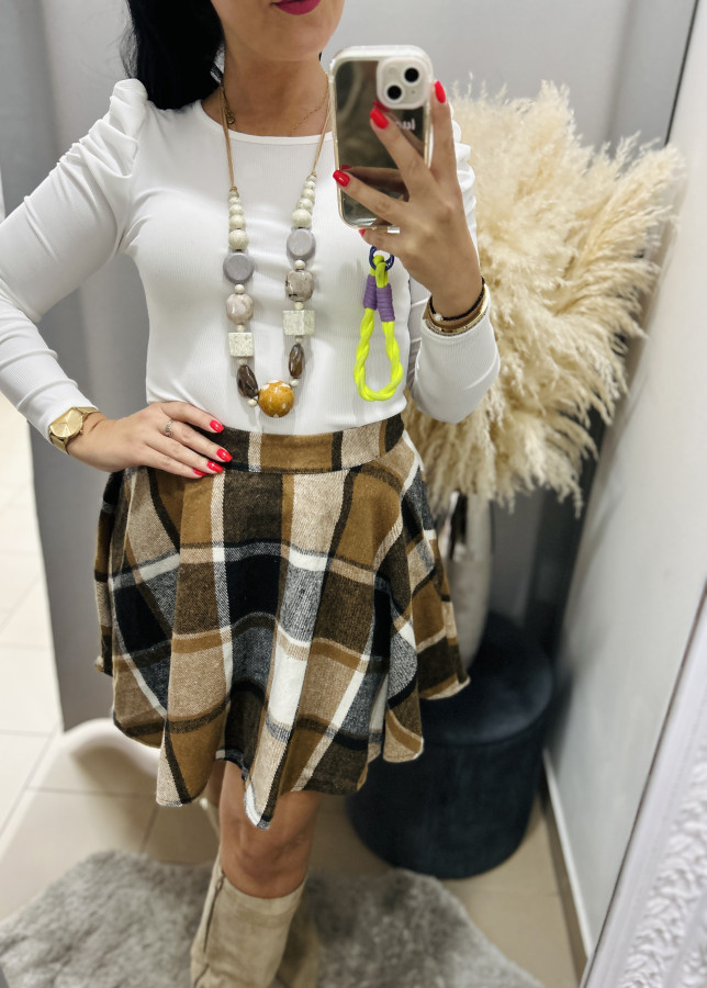 Zvýrazni svoj outfit touto krásnou áčkovou sukňou v károvanom dizajne! Teplé tóny hnedej, béžovej, čiernej a bielej vytvárajú nadčasový vzor, ktorý sa perfektne hodí k svetrom, rolákom aj rifľovým bundám. Sukňa má zapínanie na zips.