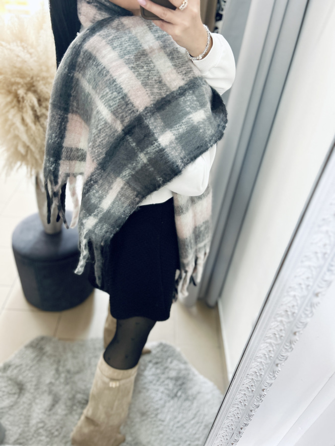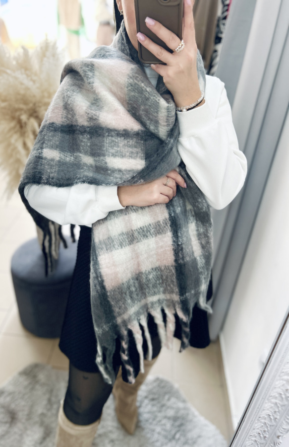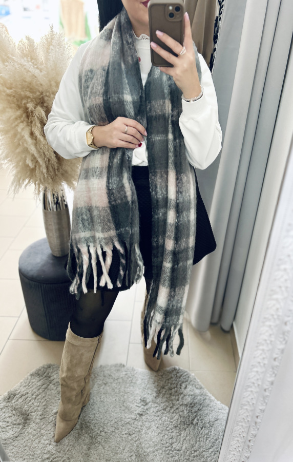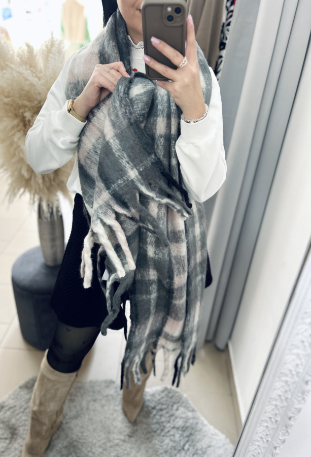 Mäkký a hrejivý károvaný šál v kombinácii sivej, bielej a svetloružovej farby je dokonalým doplnkom do chladnejších dní. Je príjemný na dotyk, nadýchaný a ľahko sa kombinuje s akýmkoľvek outfitom.