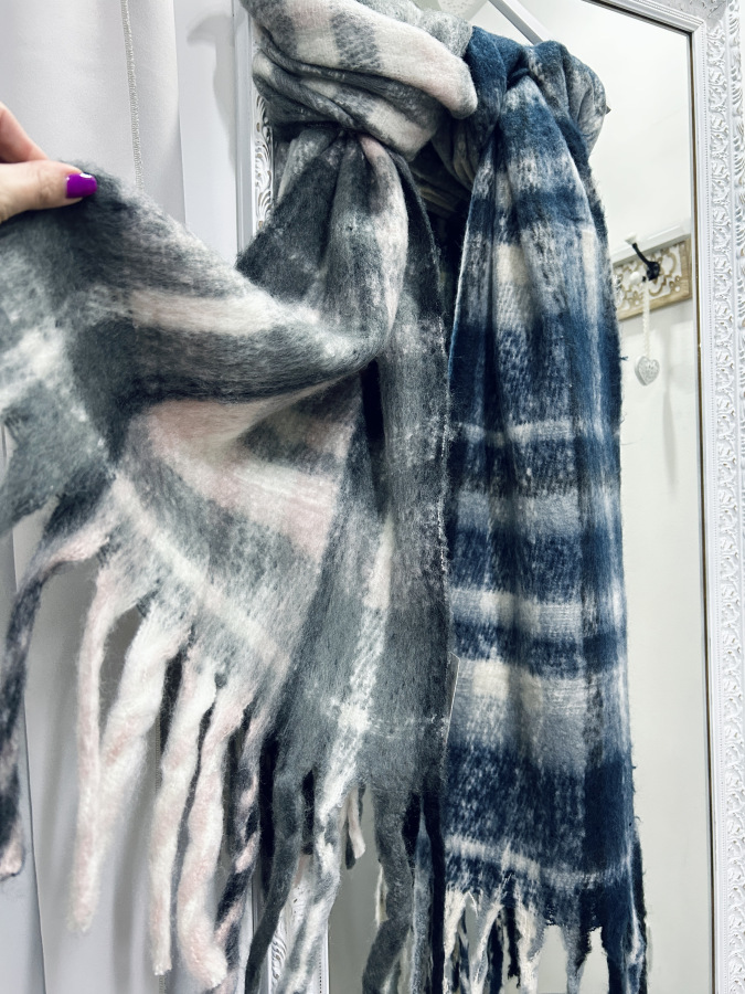 Mäkký a hrejivý károvaný šál v kombinácii farieb je dokonalým doplnkom do chladnejších dní. Je príjemný na dotyk, nadýchaný a ľahko sa kombinuje s akýmkoľvek outfitom.