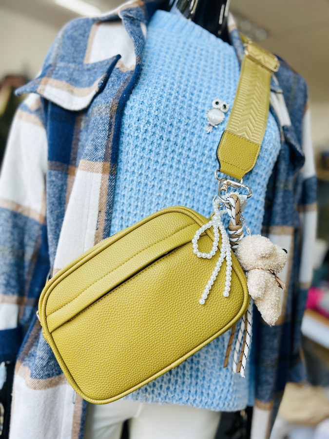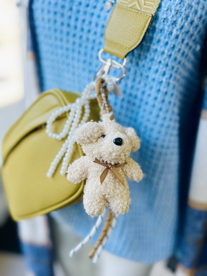 Táto hebká kľúčenka v tvare rozkošného medvedíka je ideálnym doplnkom na kabelku, batoh alebo kľúče. Medvedík je vyrobený z mäkkého plyšu s kučeravou textúrou a zdobený hnedou saténovou mašličkou. Kovový krúžok je doplnený o dekoratívne šnúrky a biele perličky, ktoré dodávajú kľúčenke štýlový a hravý vzhľad.