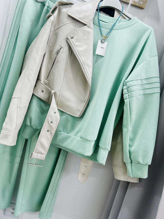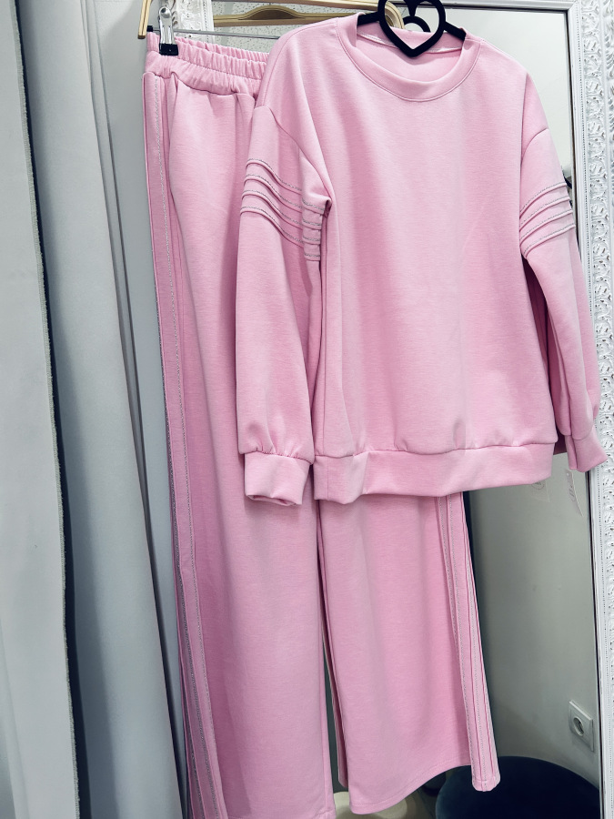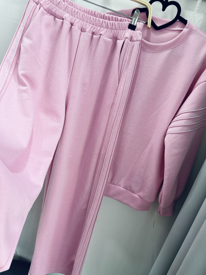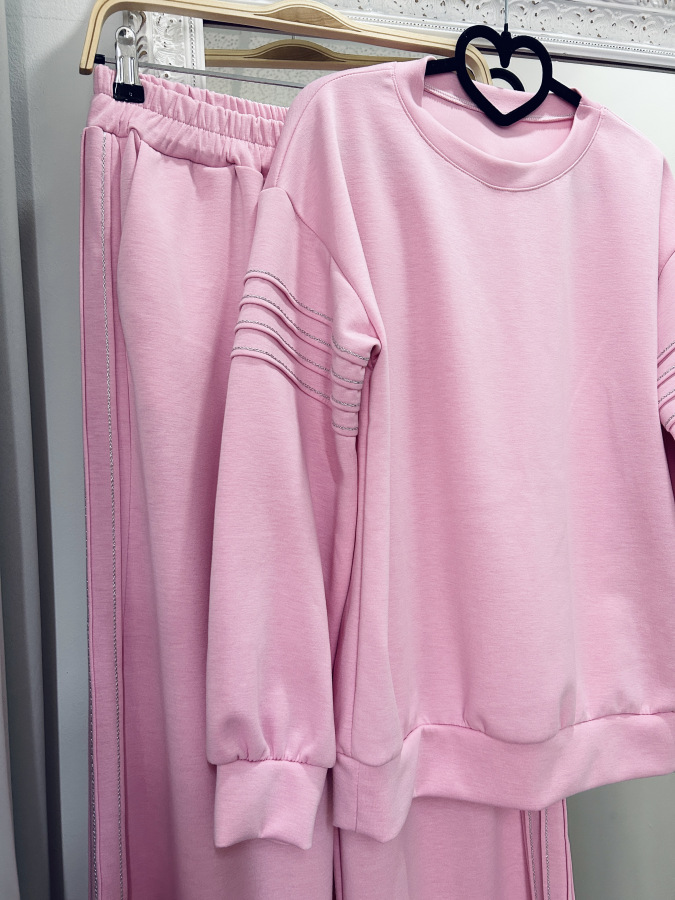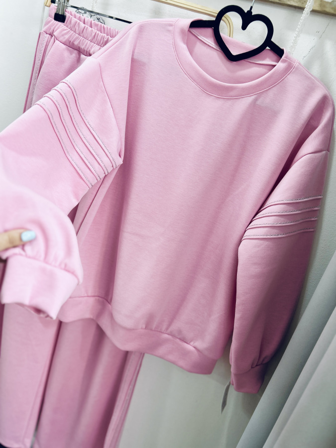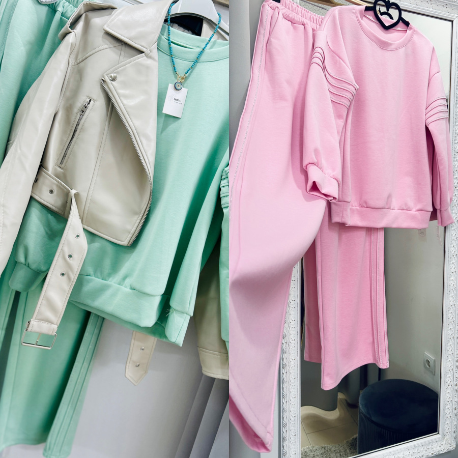 Pohodlný komplet z mikinky a teplákov v krásnej mentolovej a svetloružovej farbe.