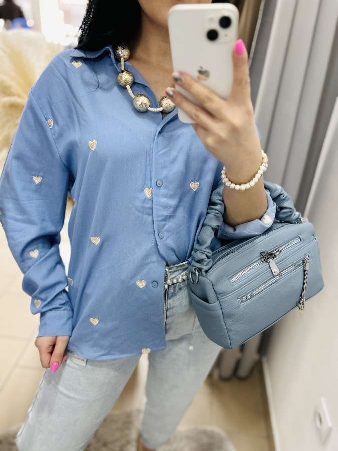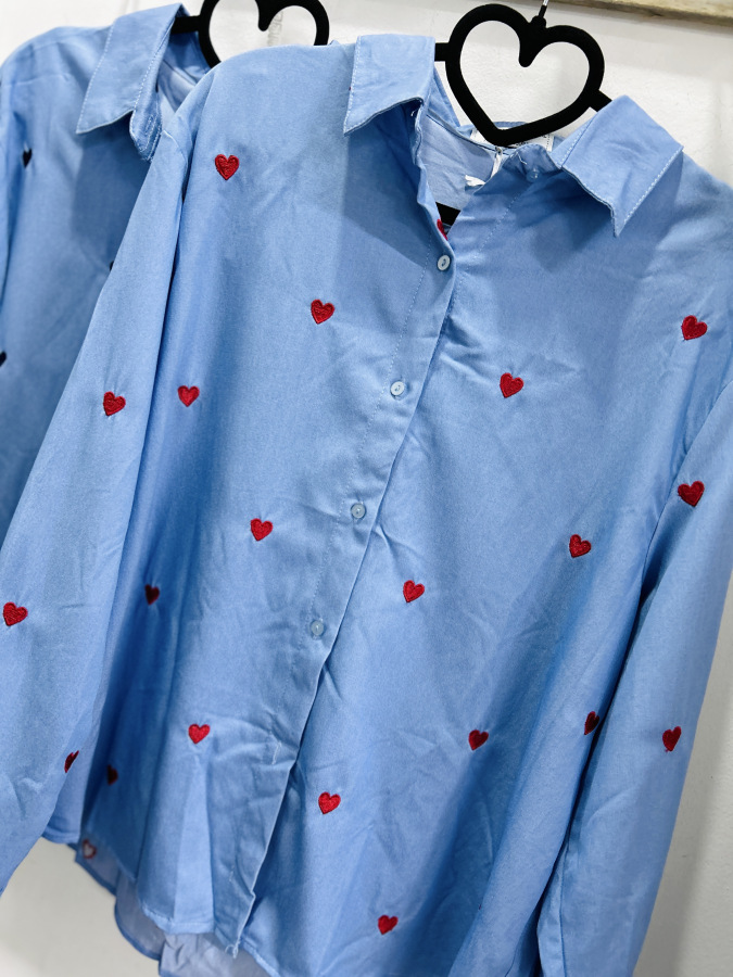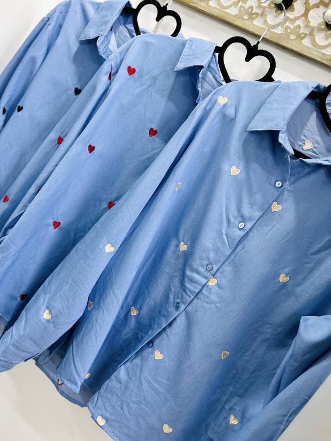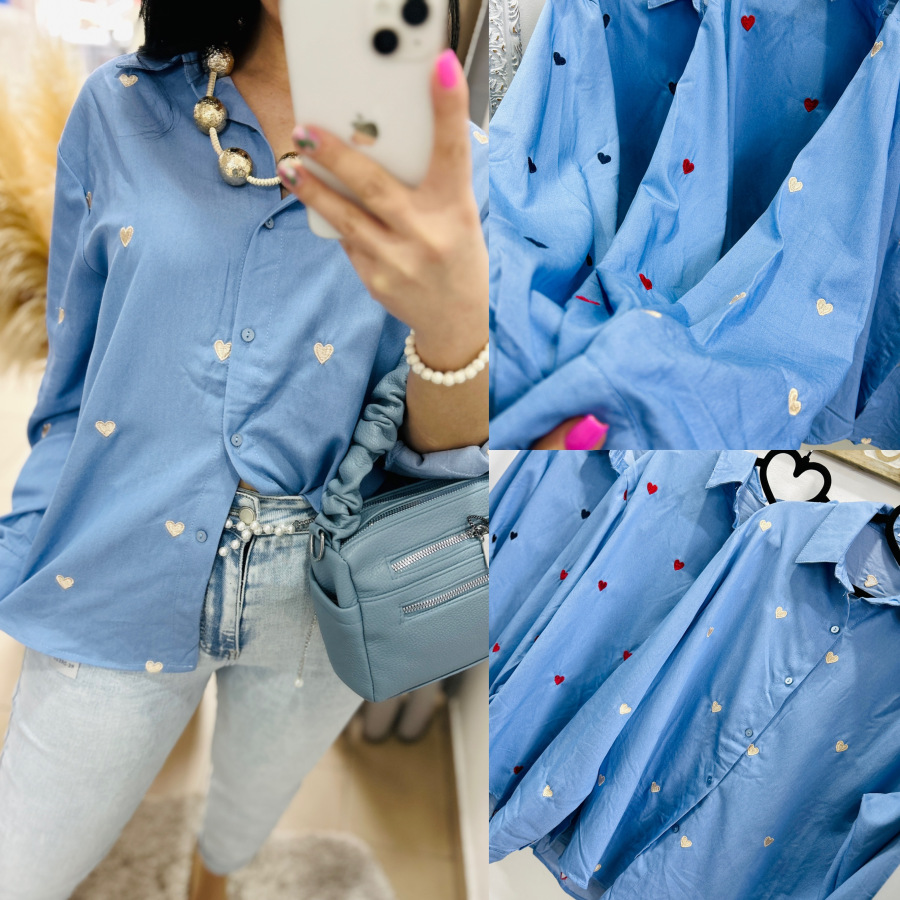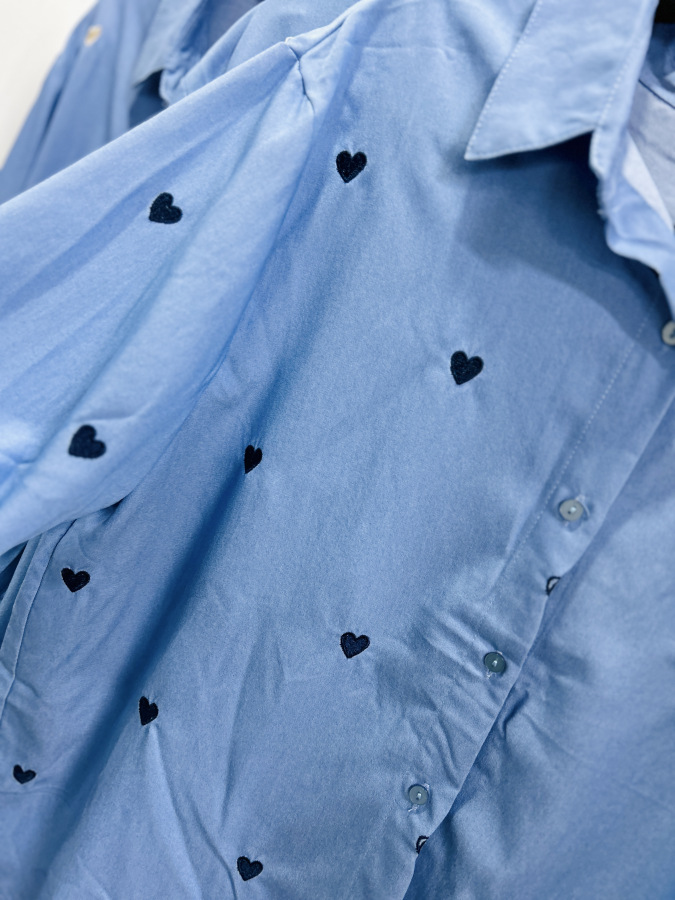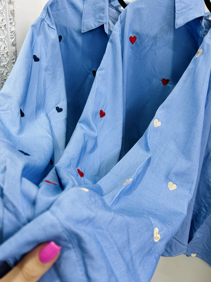 Modrá košeľa s golierom, zapínaním na gombíky zdobená vyšívanými srdiečkami v béžovej, červenej alebo tmvomodrej farbe.