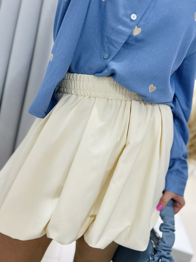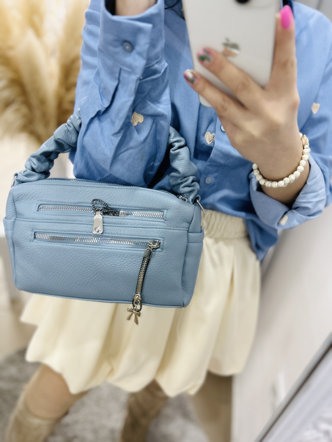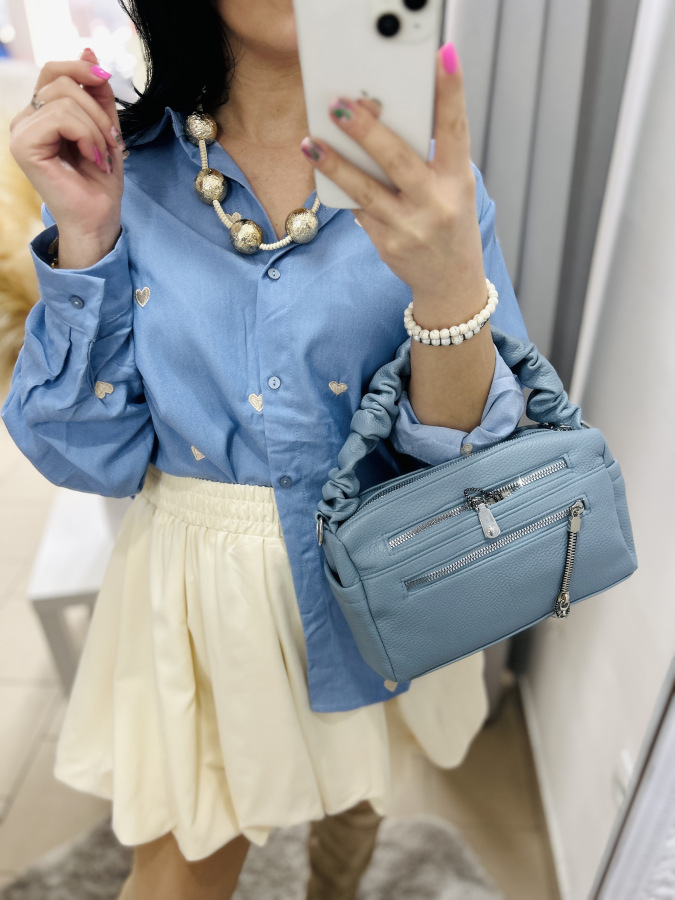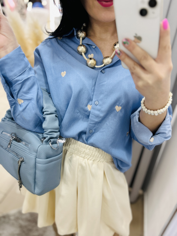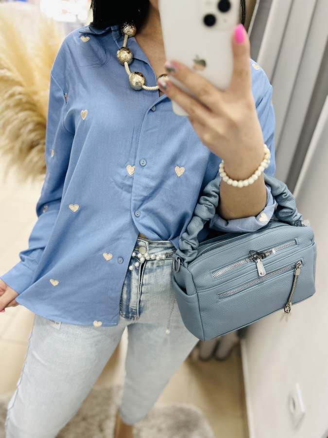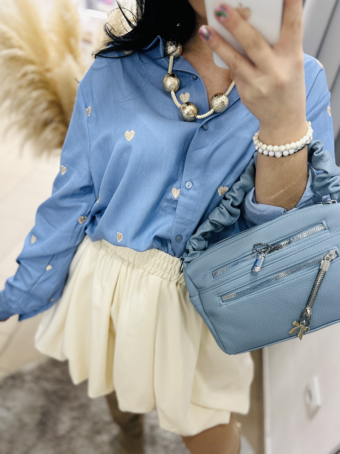 Modrá košeľa s golierom, zapínaním na gombíky zdobená vyšívanými srdiečkami v béžovej, červenej alebo tmvomodrej farbe.