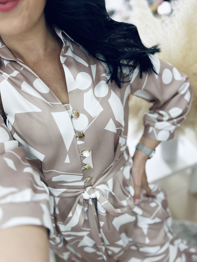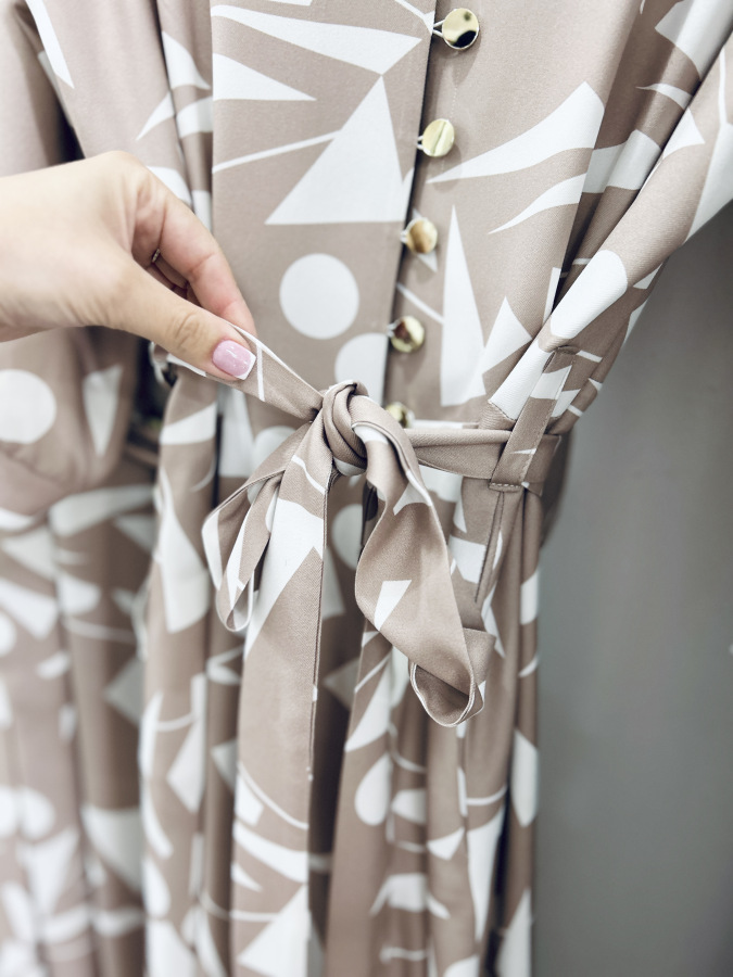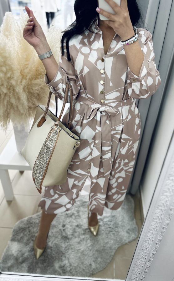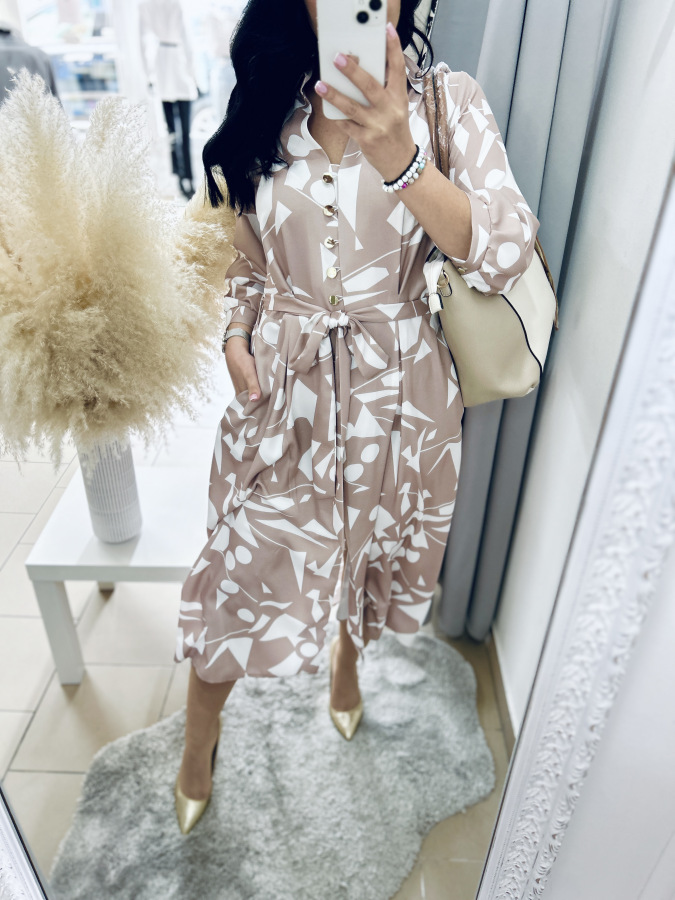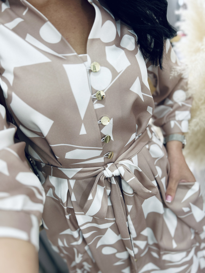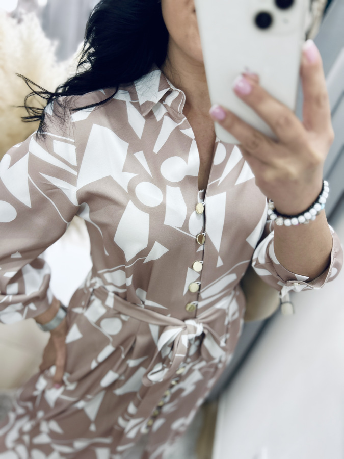 Šaty s moderným geometrickým vzorom v jemných béžovo-bielych tónoch. Majú košeľový strih, golier, bočné vrecká, zapínanie na gombíky a viazanie v páse, ktoré krásne zvýrazní postavu. Príjemný splývavý materiál zaručuje pohodlie počas celého dňa – ideálne na bežné nosenie aj štýlové príležitosti.