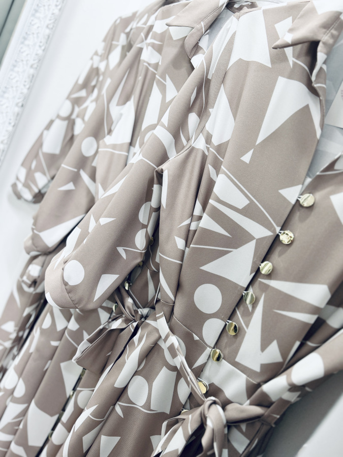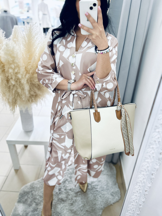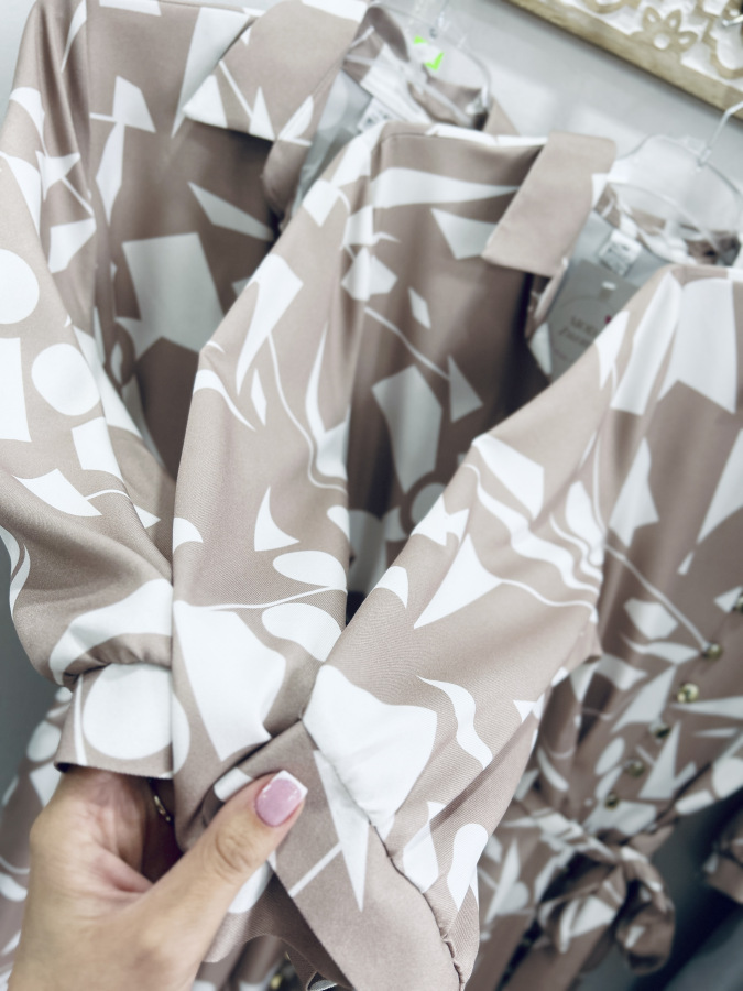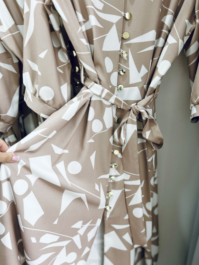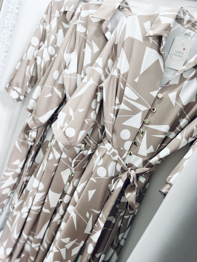 Šaty s moderným geometrickým vzorom v jemných béžovo-bielych tónoch. Majú košeľový strih, golier, bočné vrecká, zapínanie na gombíky a viazanie v páse, ktoré krásne zvýrazní postavu. Príjemný splývavý materiál zaručuje pohodlie počas celého dňa – ideálne na bežné nosenie aj štýlové príležitosti.