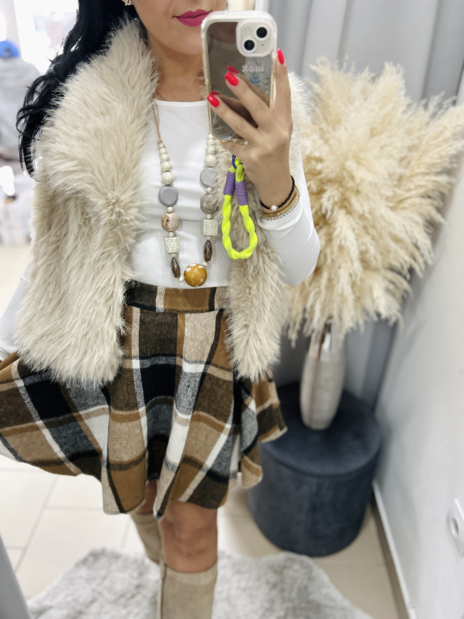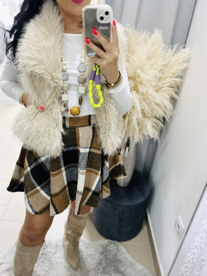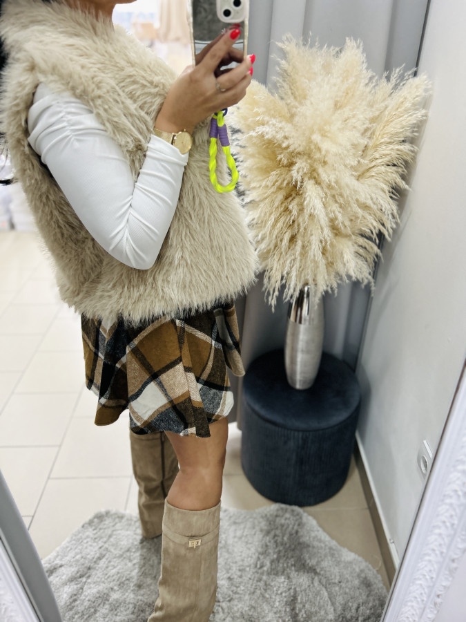 Kožušinková vestička s golierom, bočnými vreckami a zapínaním na háčiky. Veľkosti sedia podľa klasického číslovania.Modelka prezentuje veľkosť S.