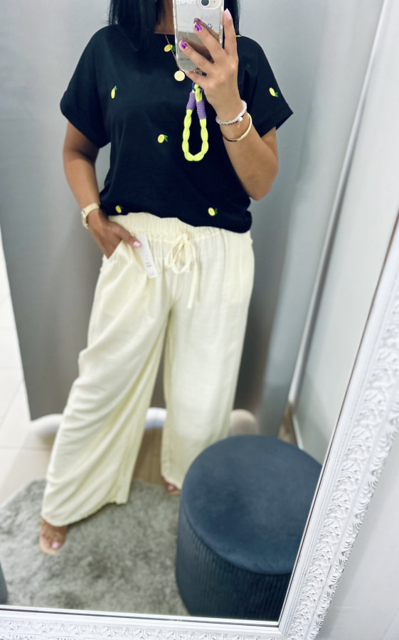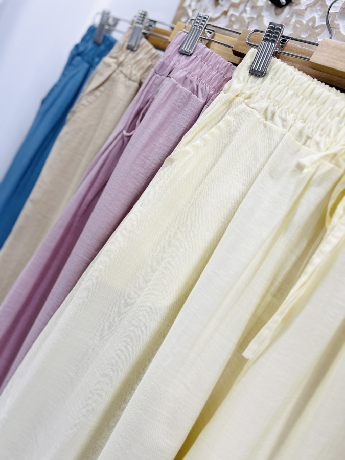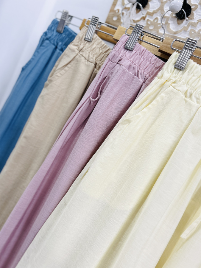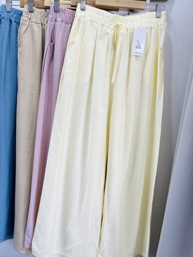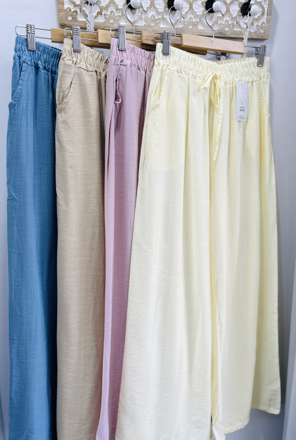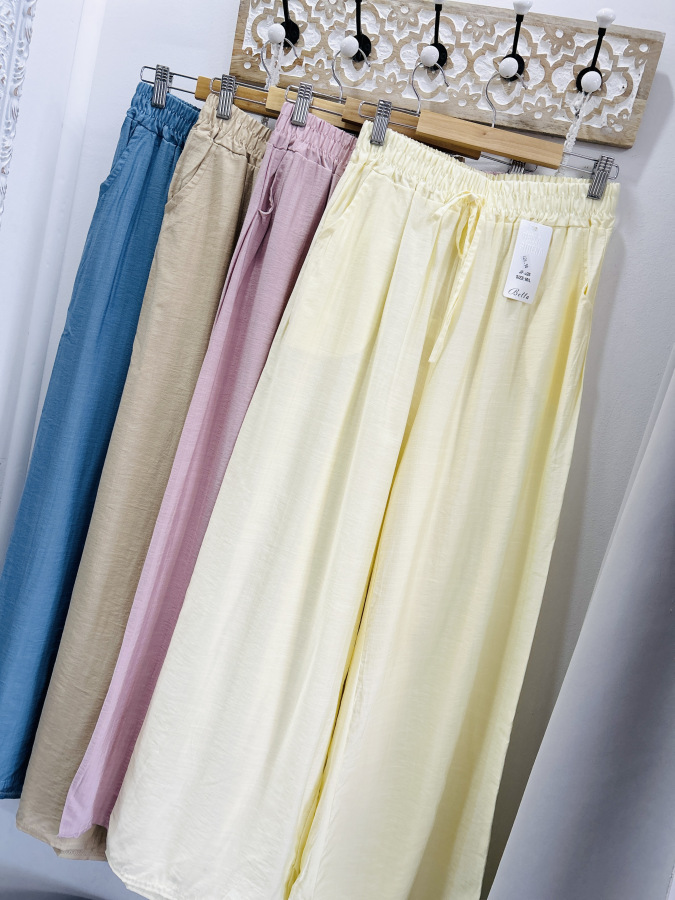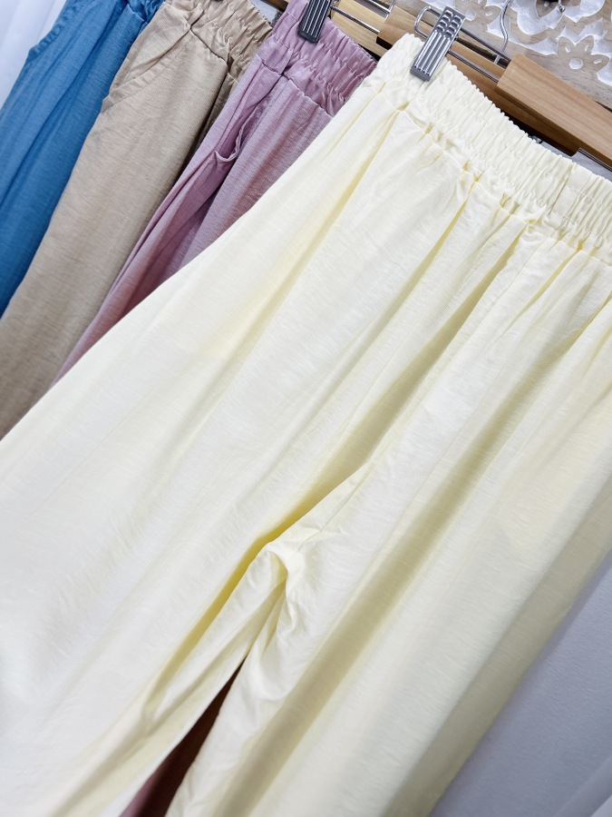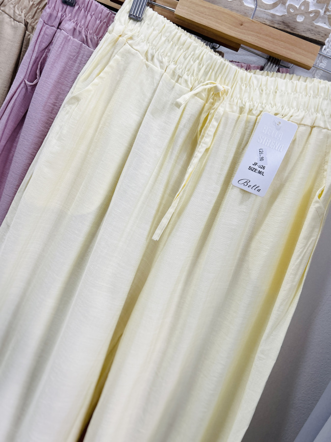 Vzdušné letné nohavice zvonového strihu v žltej a béžovej farbe. Nohavice majú v páse elastickú gumu a bočné vrecká.