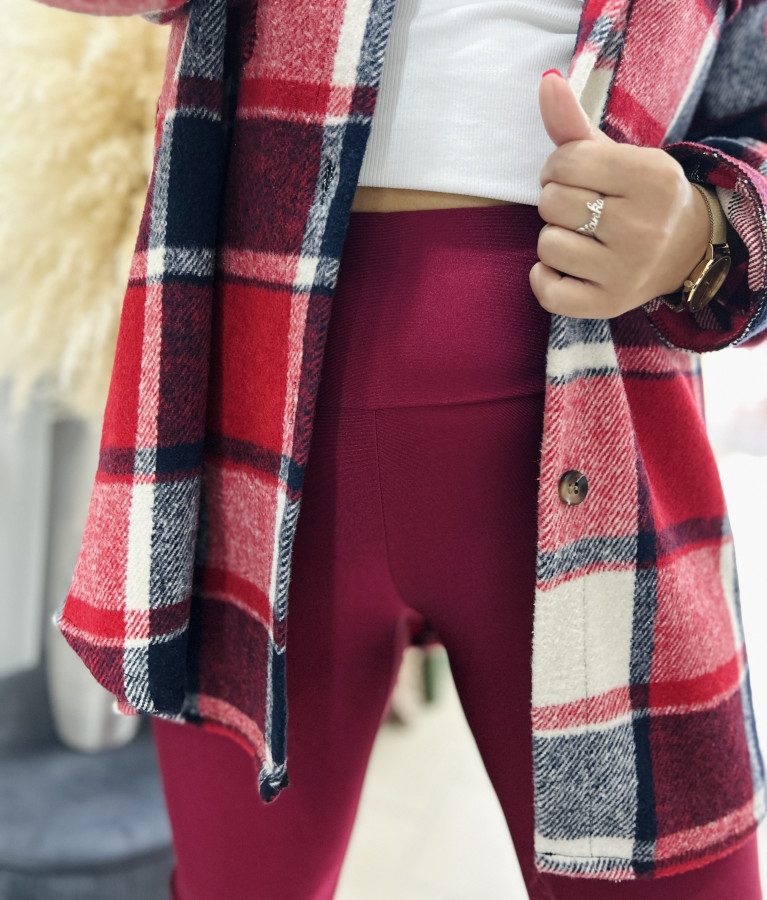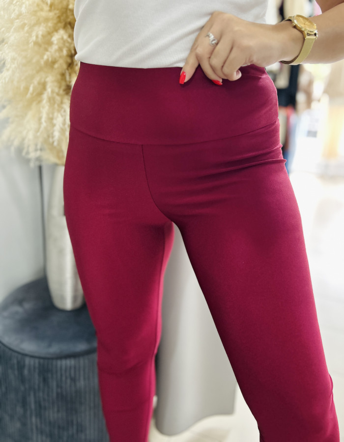 Elastické metalické legíny s vyšším pásom v bordovej farbe. Rozmery: S/M pás 64-94 cm, boky 82-105 cm, dĺžka 94 cm