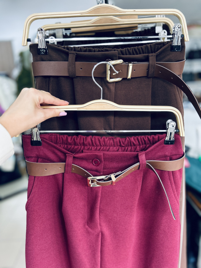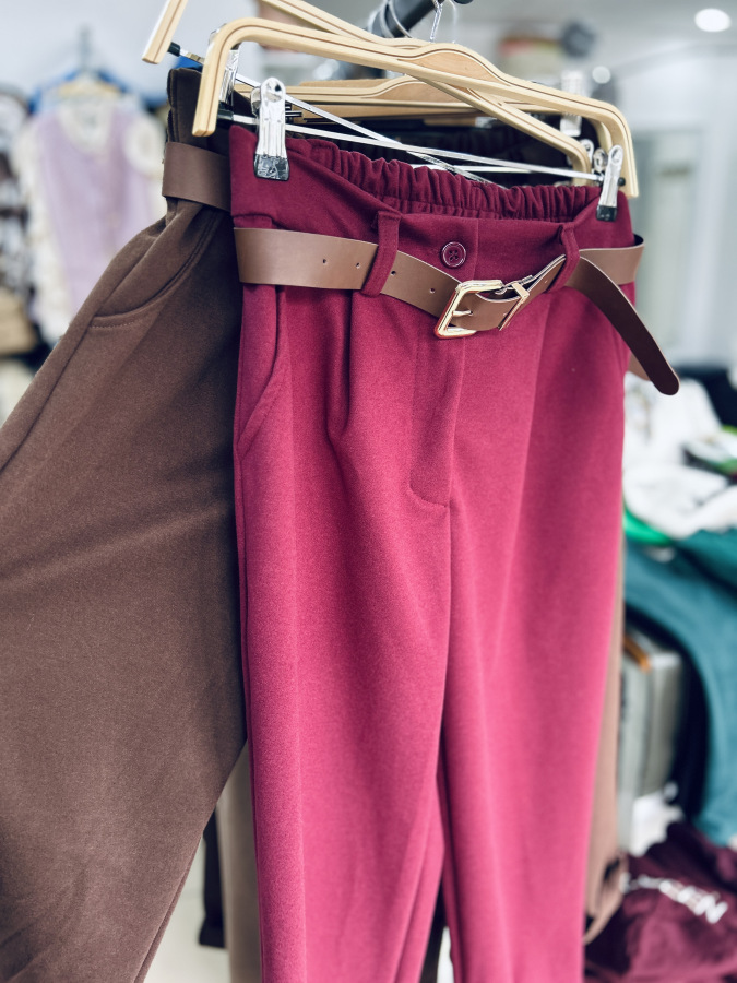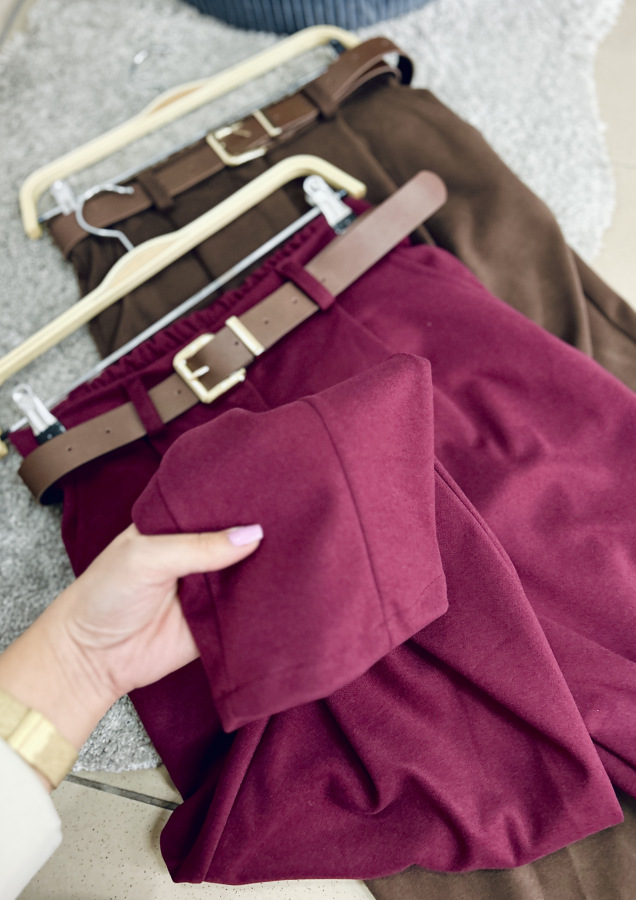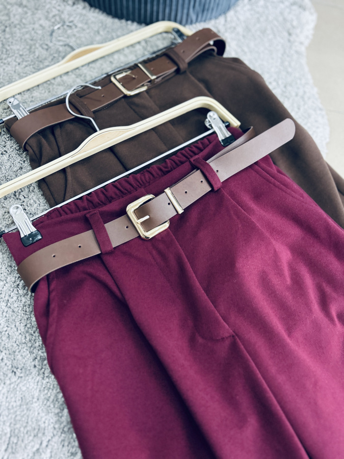 Dizajn dopĺňajú praktické bočné vrecká a ozdobné (falošné) vrecká na zadnej strane. Súčasťou nohavíc je aj hnedý opasok z koženky, ktorý dodáva celkovému vzhľadu elegantný akcent.