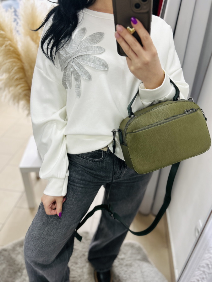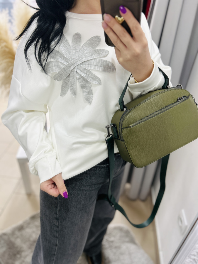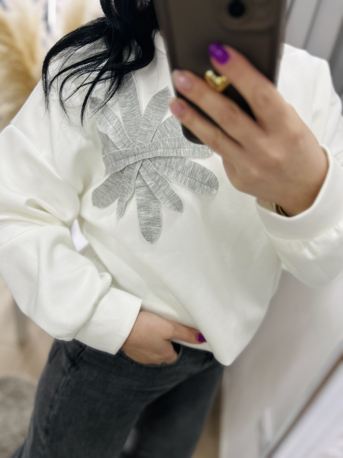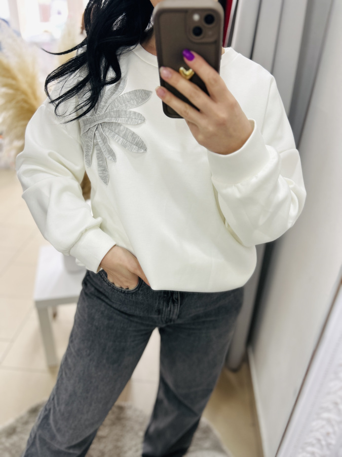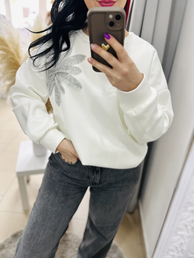 Štýlová a pohodlná mikina v jemnej mliečnej farbe, doplnená o elegantnú aplikáciu listov na ramene. Má voľnejší, moderný strih, ktorý krásne sadne na postavu a poskytuje maximálny komfort pri nosení. Mikina je vyrobená z príjemného, mäkkého materiálu, ideálna na každodenné nosenie aj ležérne kombinácie.