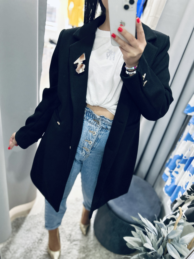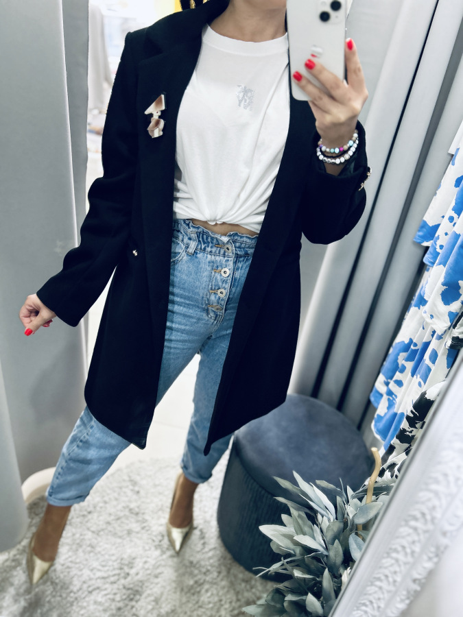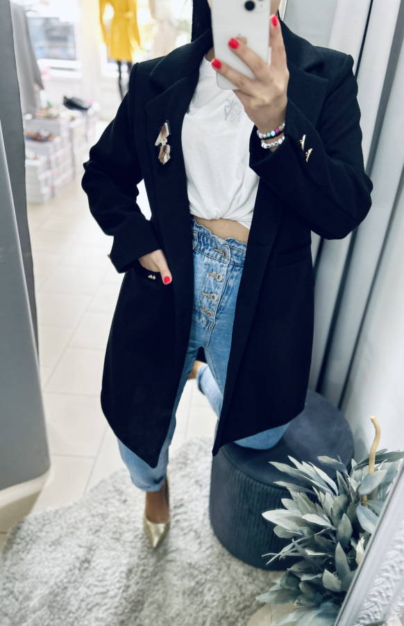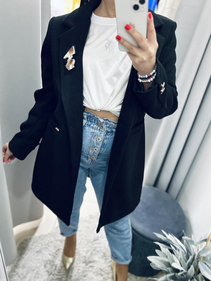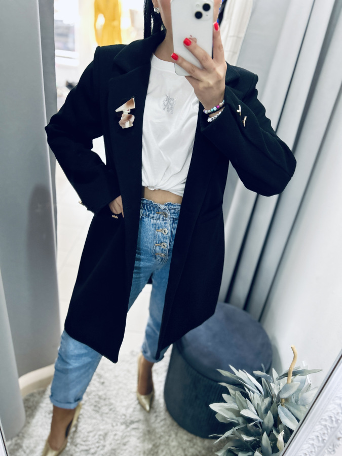Prechodný kabátik v dokonalom mierne predĺženom strihu. Zapínanie na gombíky, bočné vrecká. Brošňa je v našej ponuke samostatne.