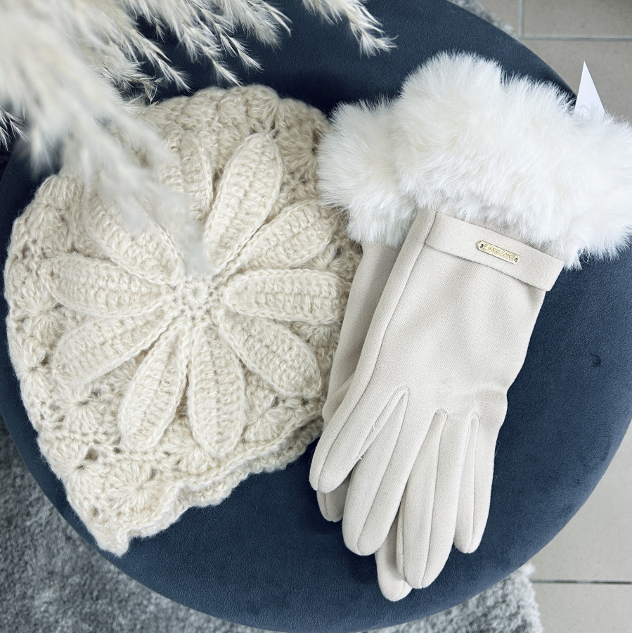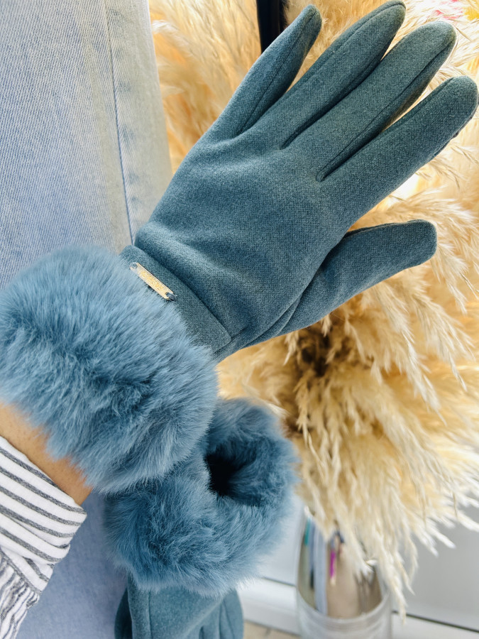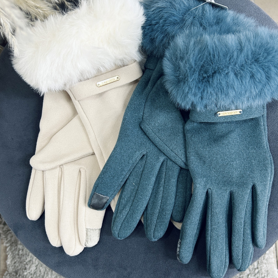 Pohodlné rukavice v modrej a smotanovej farbe zdobené kožušinkou. Na ukazováku je ozdobná nášivka vďaka ktorej môžte rukavičkami ovládať aj mobilný telefón.