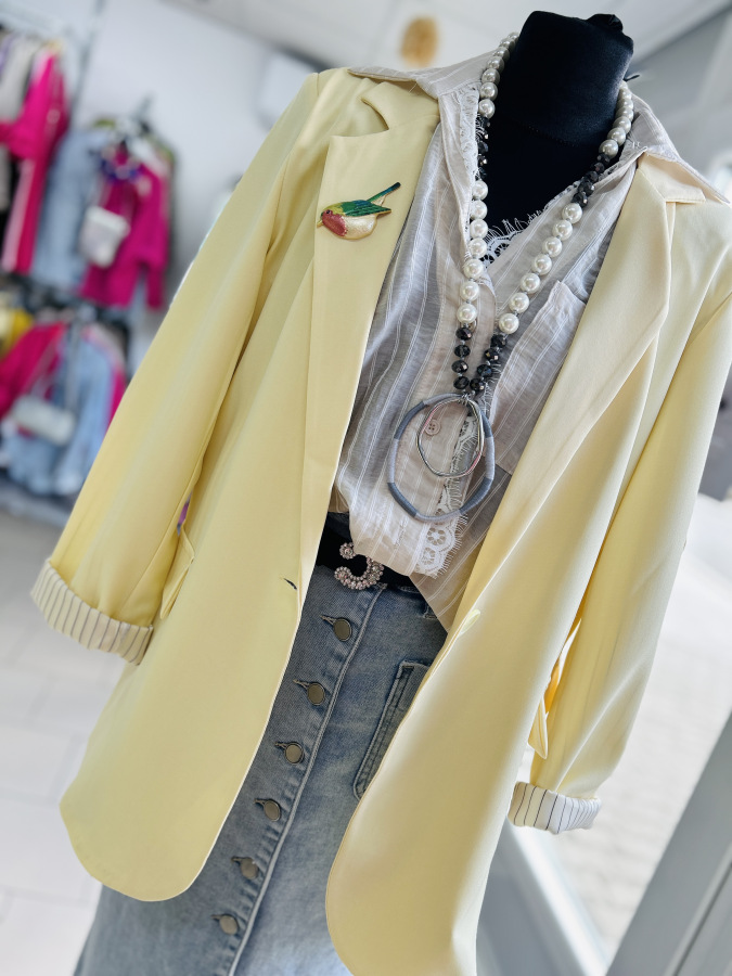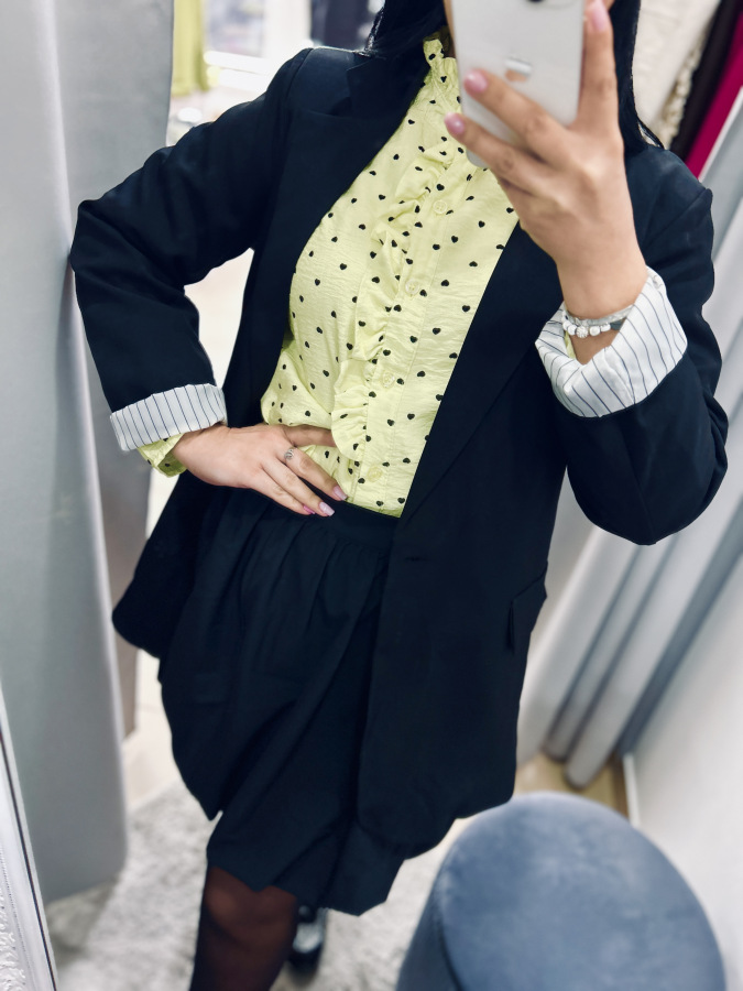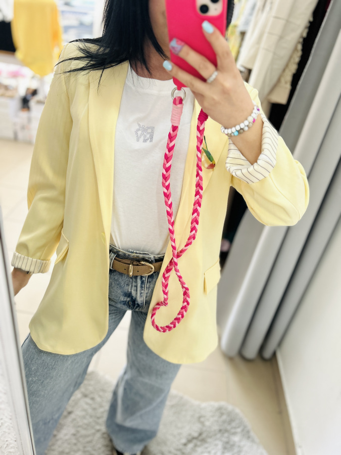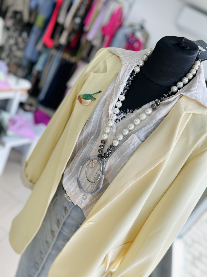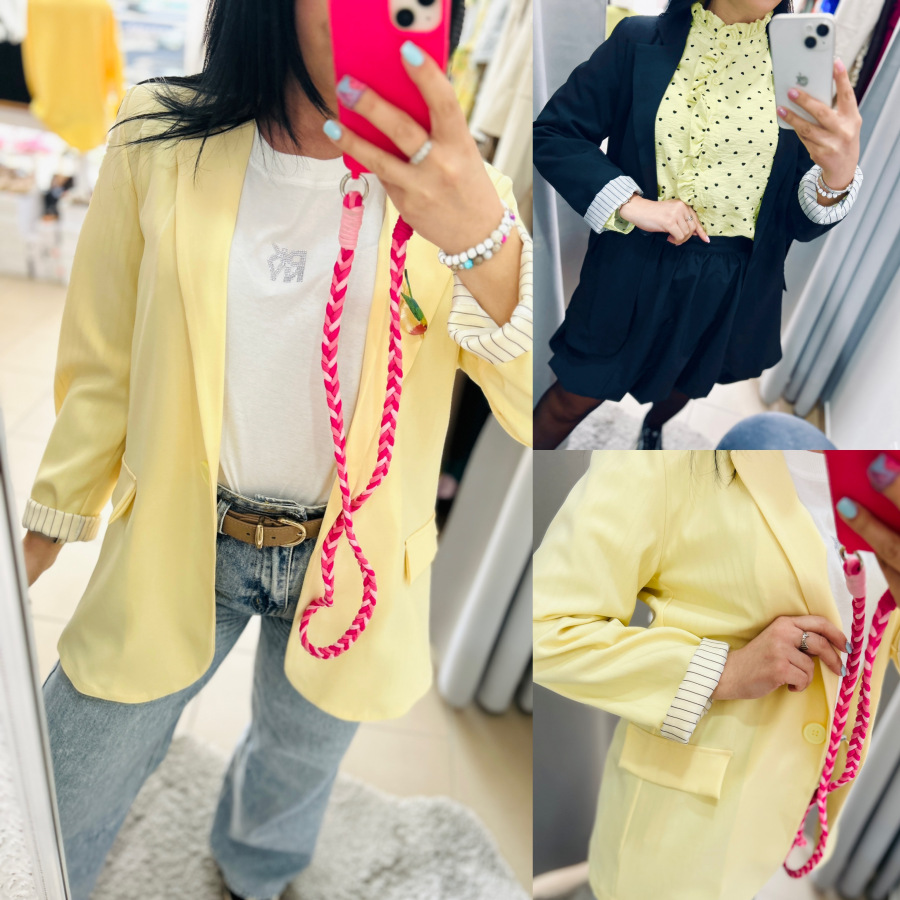 Športovo- elegantné sako s dlhými rukávmi, zapínaním na gombík, fazónkou a príchlopkami. Sako je podšité vzorovanou látkou. Veľkosť UNI (S M L)
