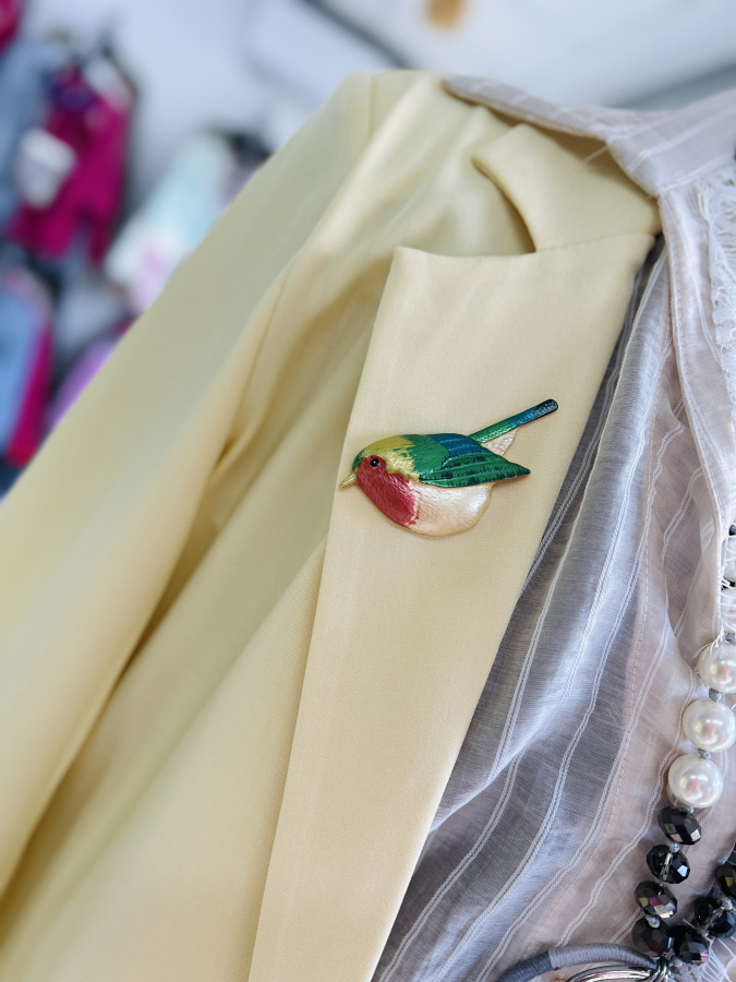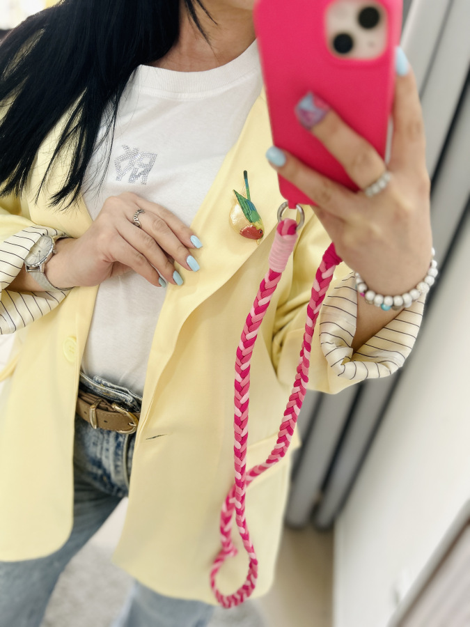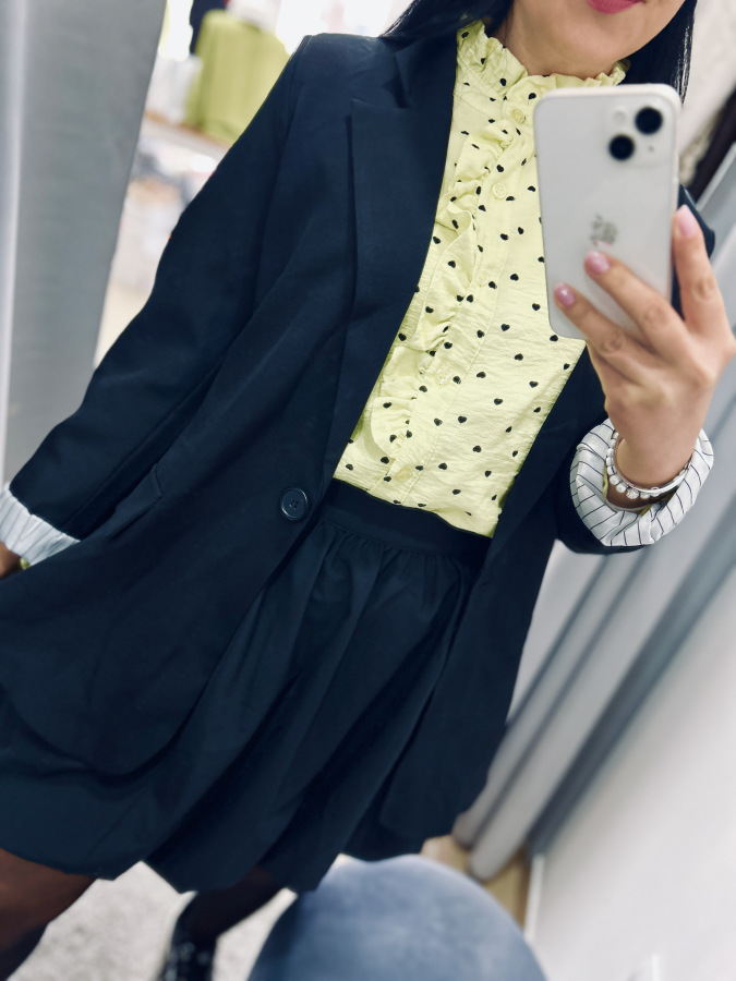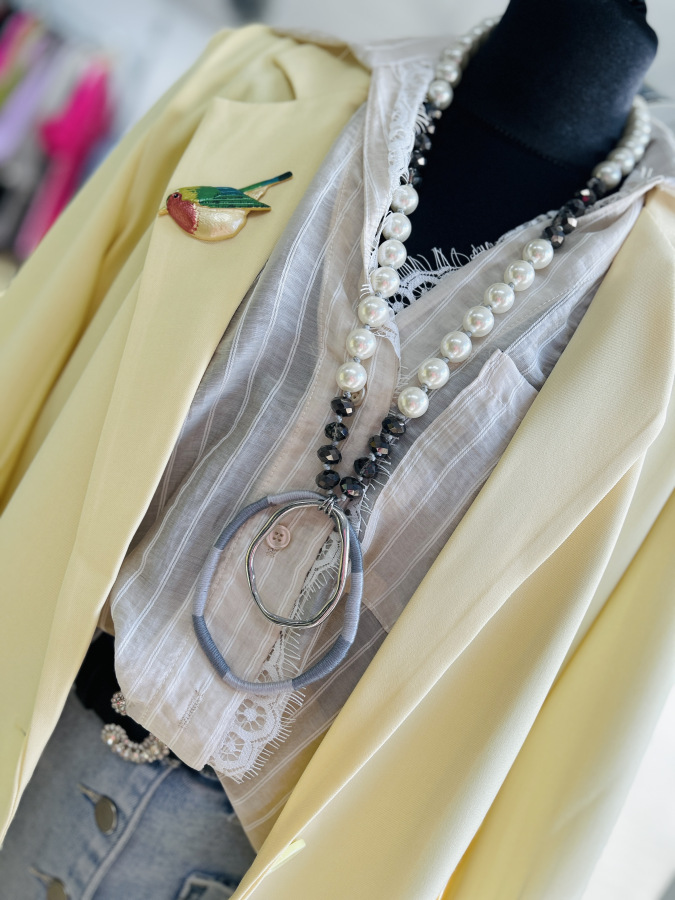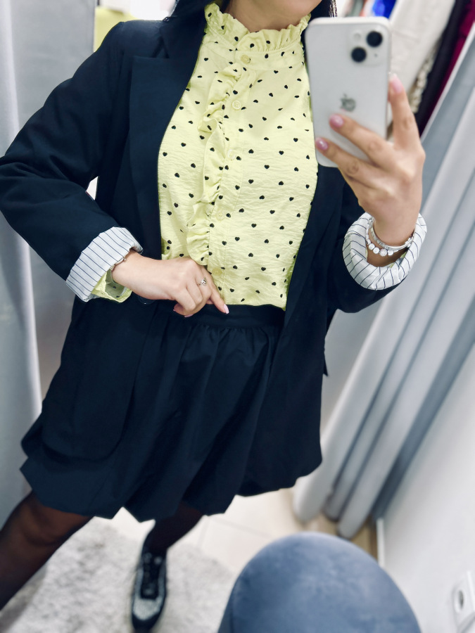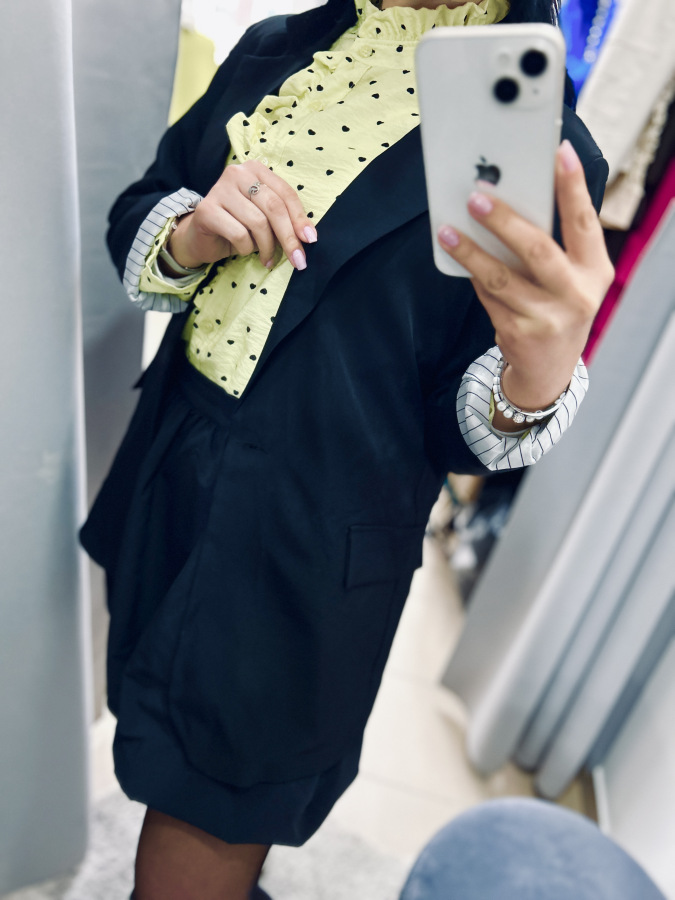 Športovo- elegantné sako s dlhými rukávmi, zapínaním na gombík, fazónkou a príchlopkami. Sako je podšité vzorovanou látkou. Veľkosť UNI (S M L)
