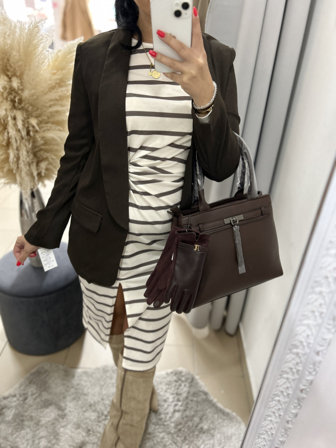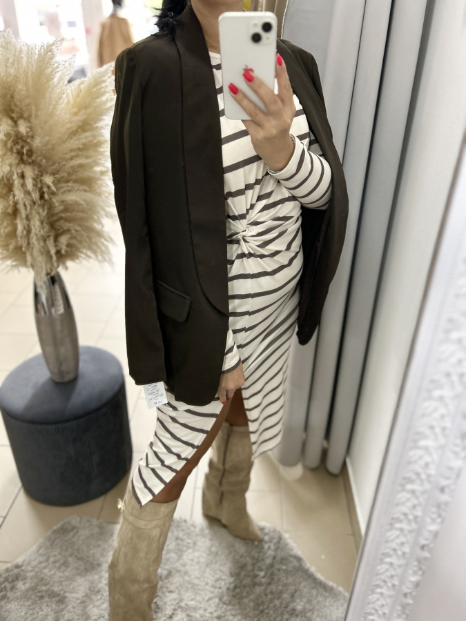 Podšité sako v béžovej farbe s falošnými vreckami a dlhým rukávom. Sako je zdobené lemom, bez zapínania. Veľkosť UNI (XS S M)