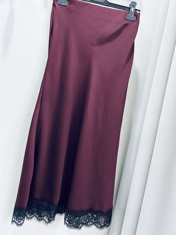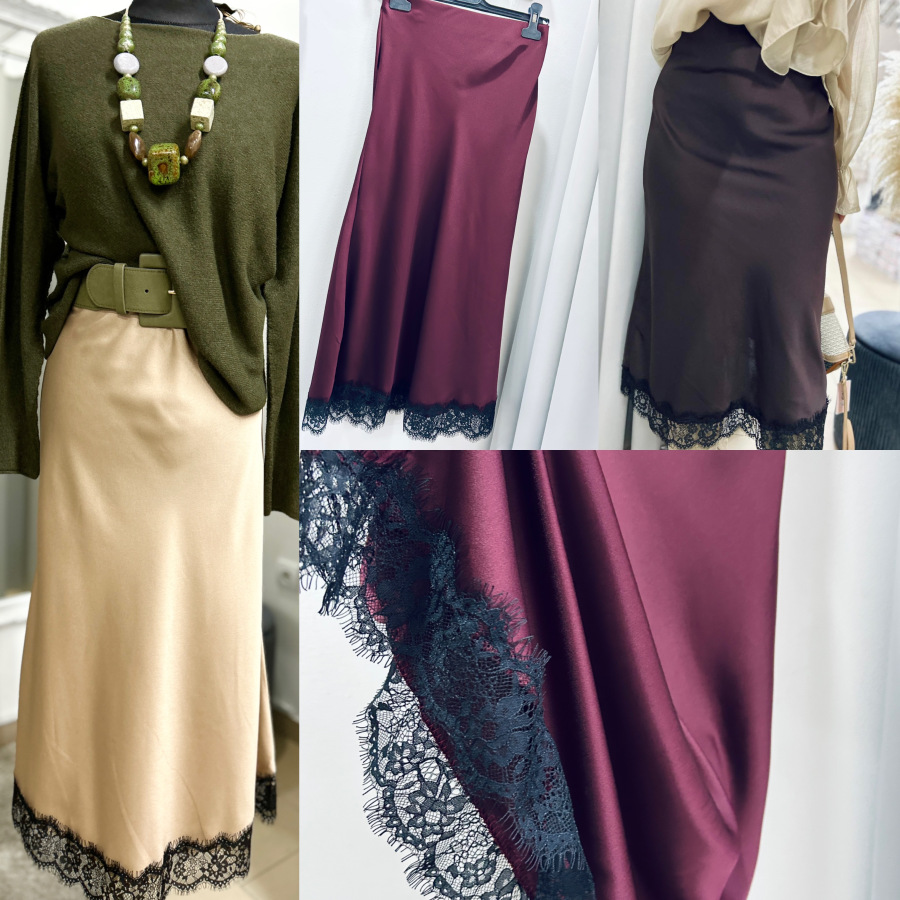 Elegantná saténová sukňa v midi dĺžke je ušitá na pohodlnú elastickú gumu v páse, takže sa krásne prispôsobí postave. Spodná časť je zdobená jemnou krajkou, ktorá modelu dodáva ženskosť a luxusný nádych. Veľkosť UNI sedí na XS–S–M.