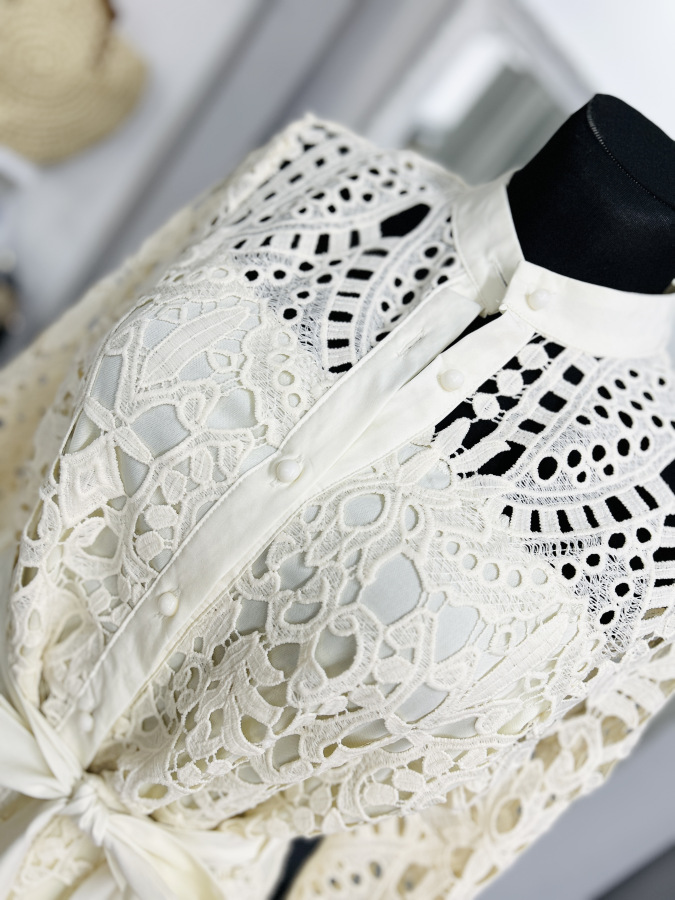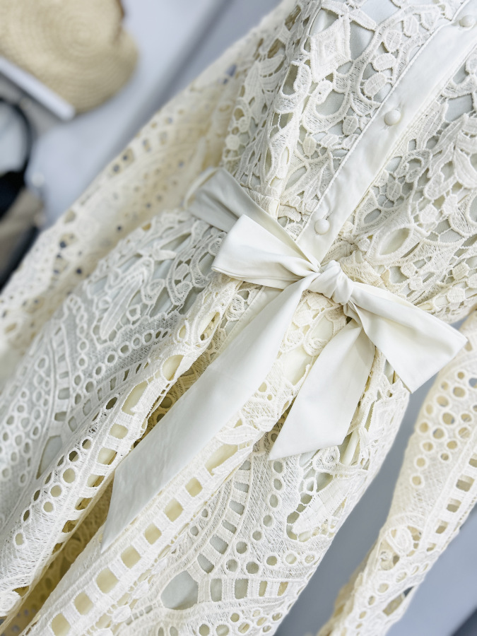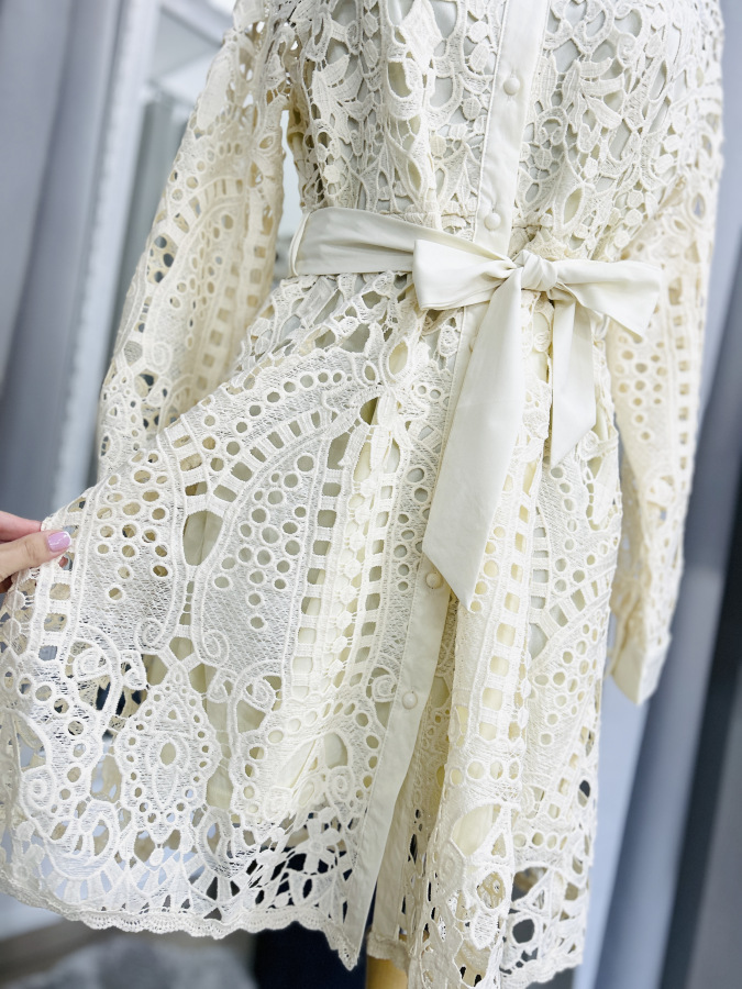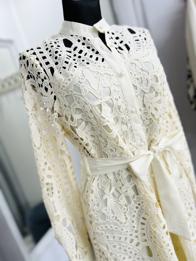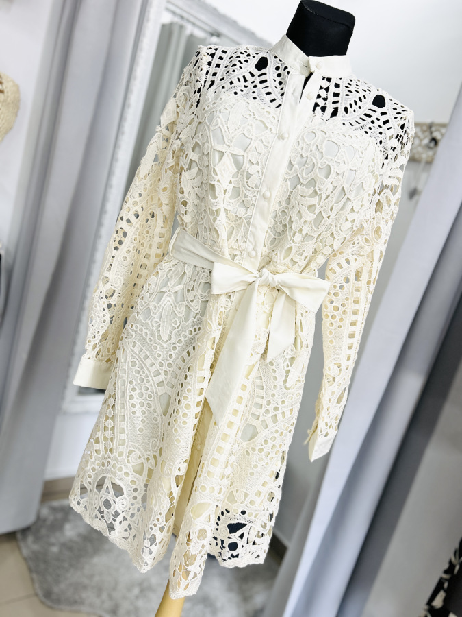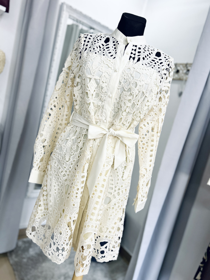 Nádherné šaty košeľového strihu zdobené krajkou, dlhými rukávmi a látkovým opaskom. Veľkosť UNI (S M L)