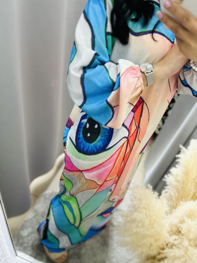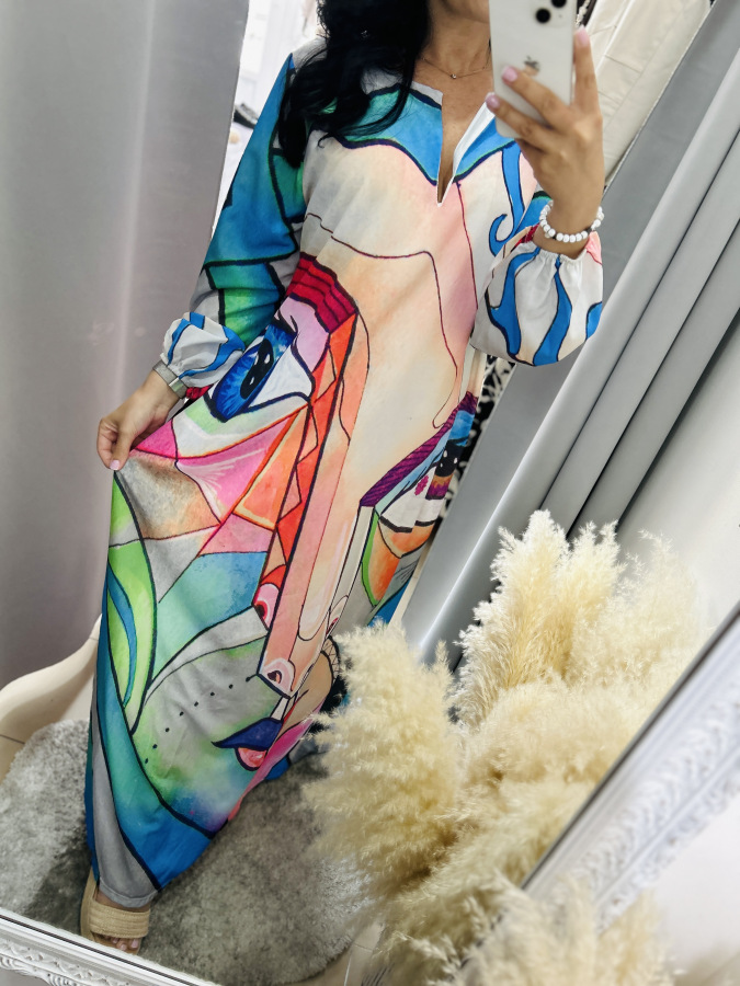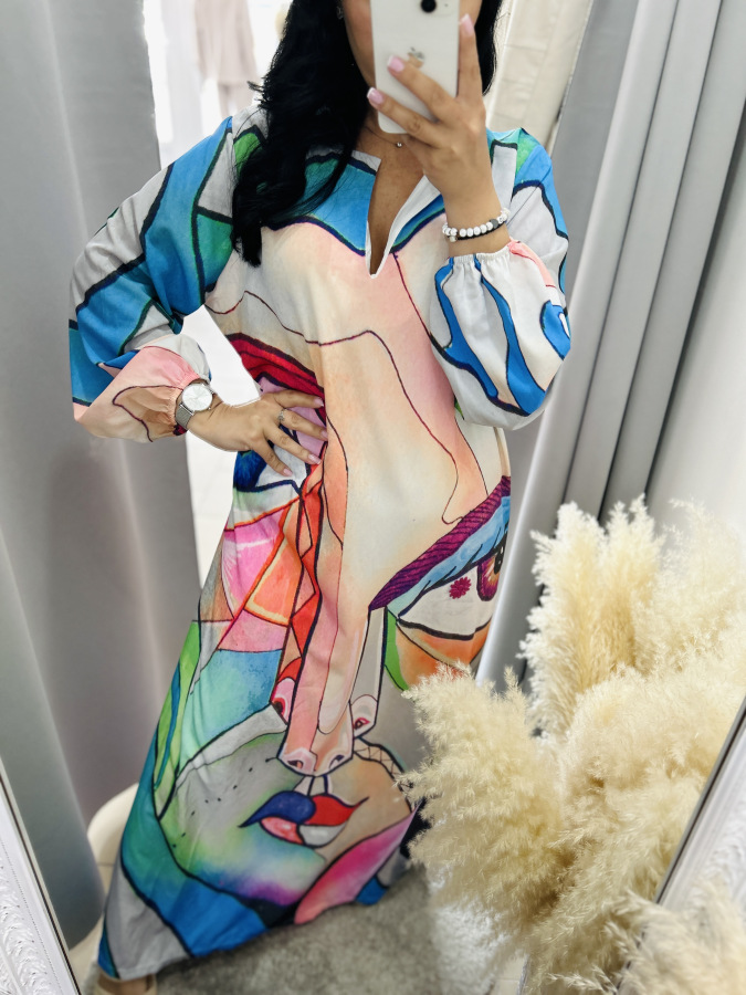 Nádherné šaty na jar a leto s ,,Picasso" motívom. Rukáv je dlhý, ukončený gumičkou, mierny véčkový výstrih. Veľkosť UNI (L XL XXL) RozmeryPrsia: 120 cm Dĺžka: 139cm