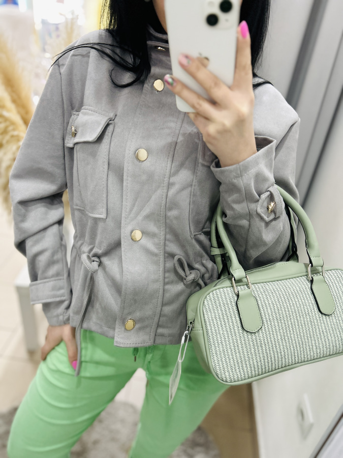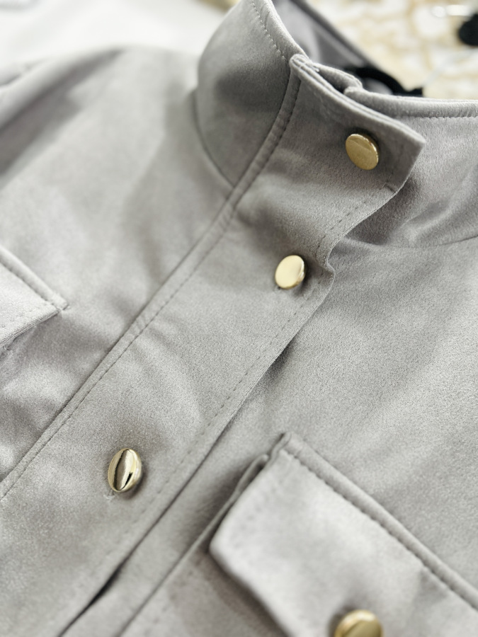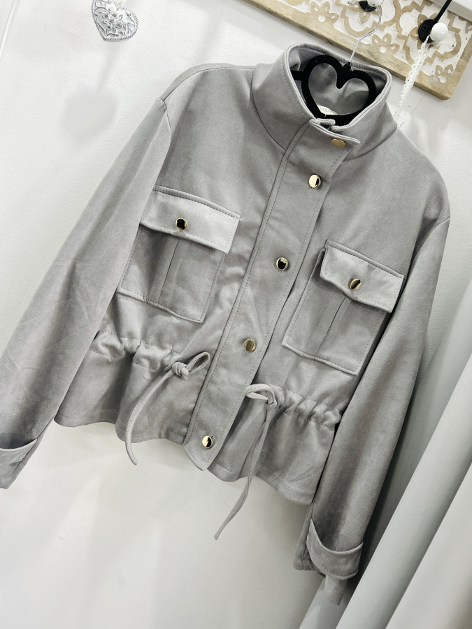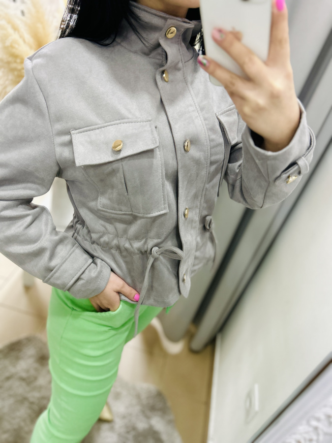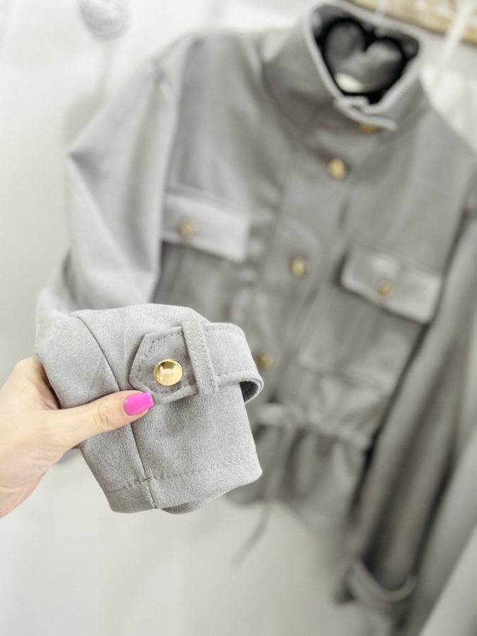 Prechodná semišová bundička v sivej farbe so zapínaním na zlaté gombíky. Bundička má príchlopky na prsiach a možnosť sťahovania v páse.
