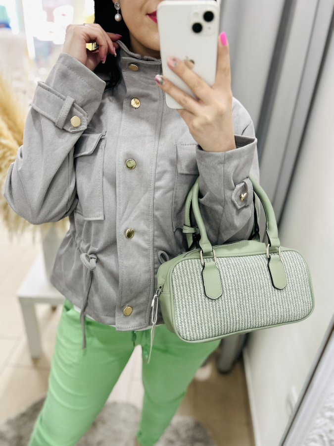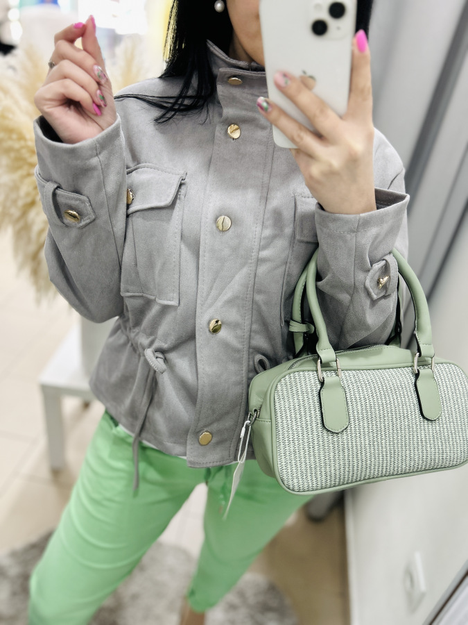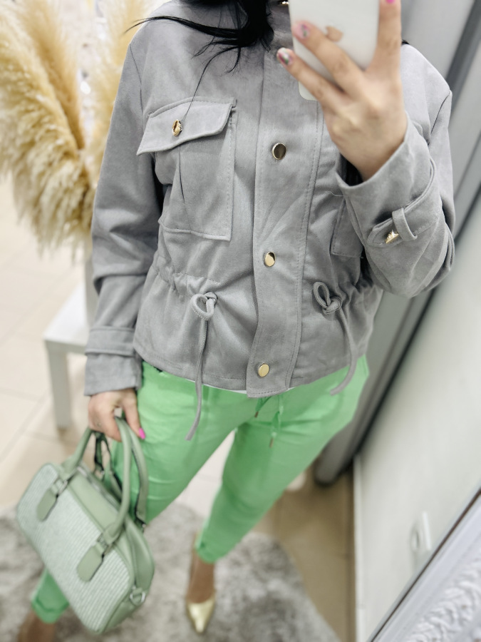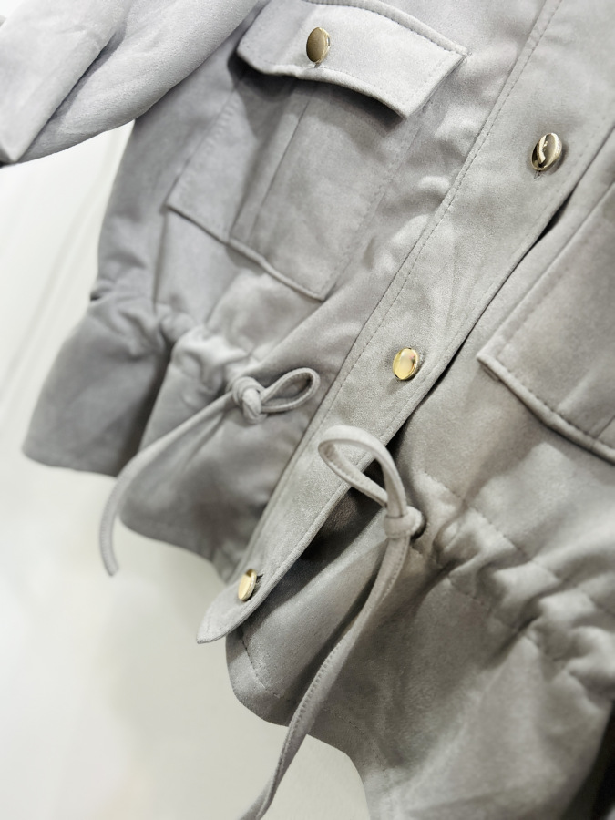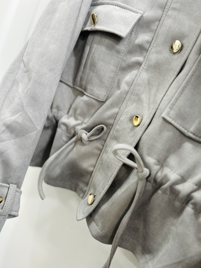 Prechodná semišová bundička v sivej farbe so zapínaním na zlaté gombíky. Bundička má príchlopky na prsiach a možnosť sťahovania v páse.