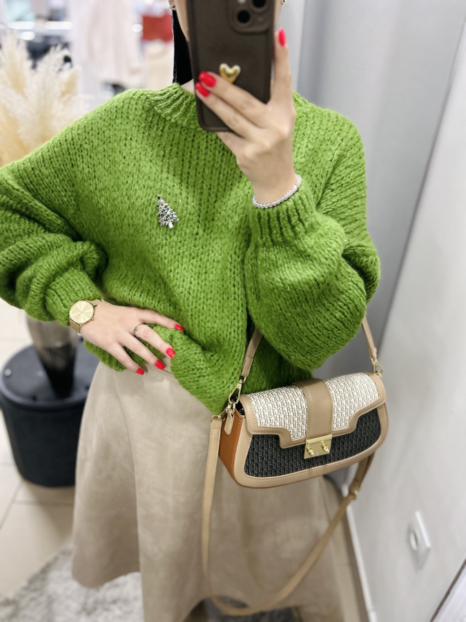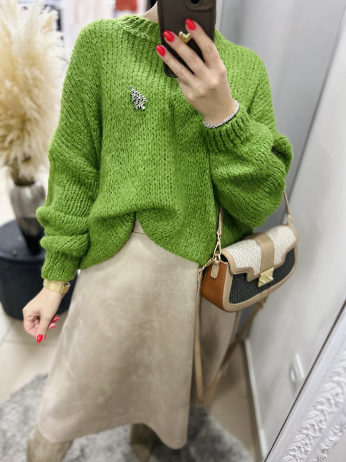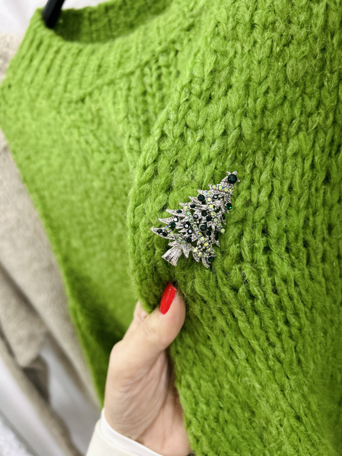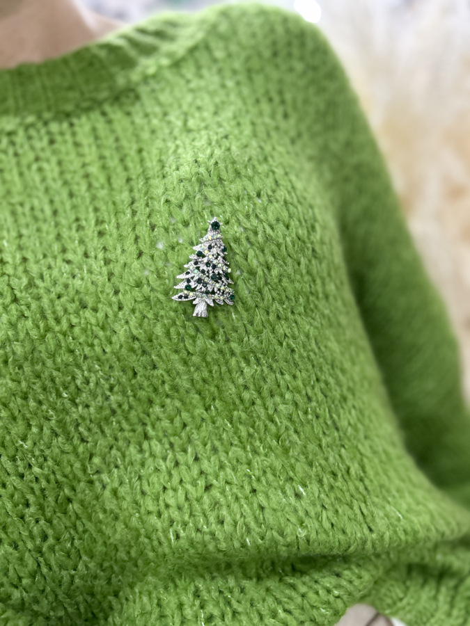 Skvelým detailom je malá brošňa v tvare stromčeka, ktorá dodáva svetru jemný sviatočný nádych, no stále ostáva elegantná. Brošňa je v ponuke samosttane. Perfektne ho skombinuješ so sukňami, džínsami či koženými nohavicami.