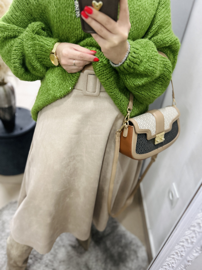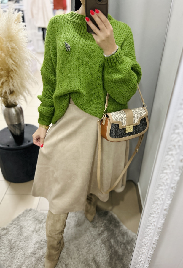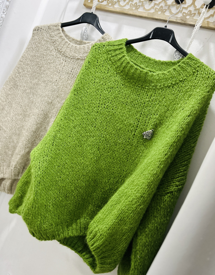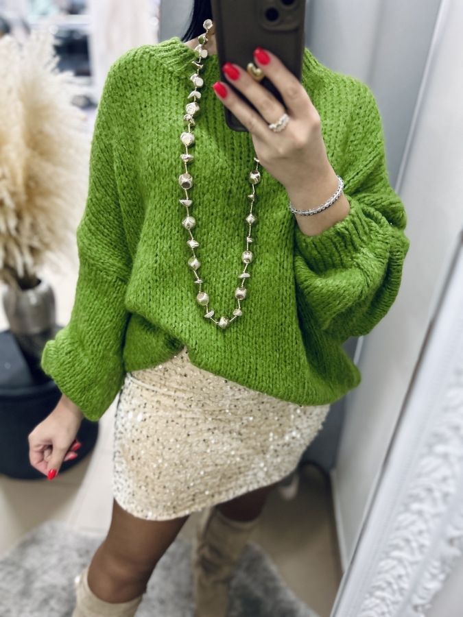Tento nadýchaný pletený sveter v šťavnatej zelenej alebo béžovej farbe je ideálnym kúskom na chladné dni. Má pohodlný oversize strih, rebrovaný lem pri krku, rukávoch aj spodnom okraji, vďaka čomu krásne drží tvar. Textúrovaná priadza pôsobí ručne pleteným dojmom.