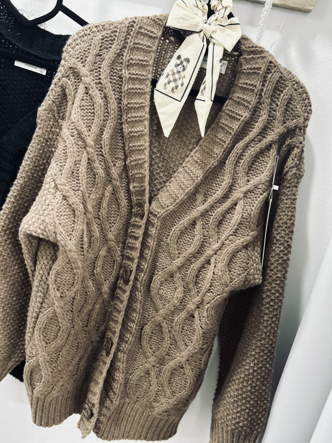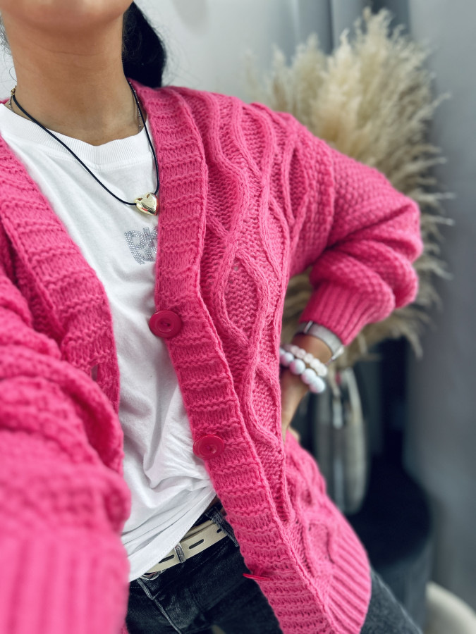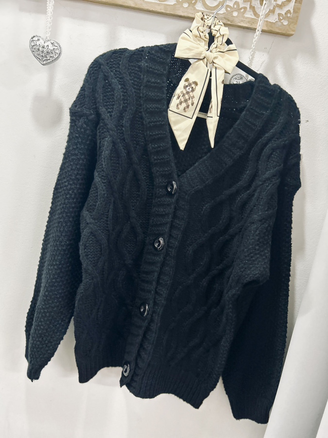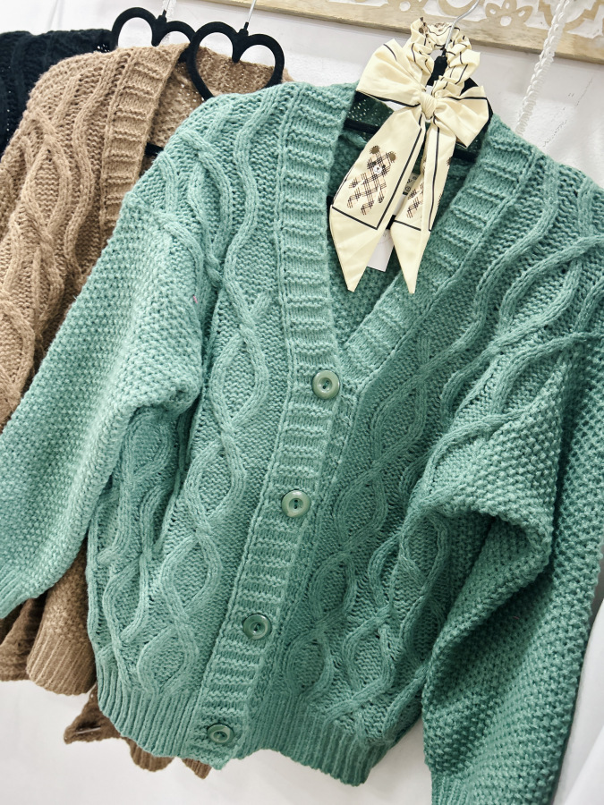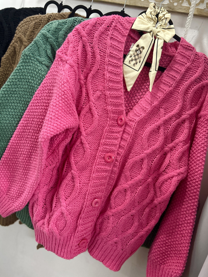 Pletený svetrík mierného oversize strihu so zapínaním na gombíky. Veľkosť UNI (M L XL)
