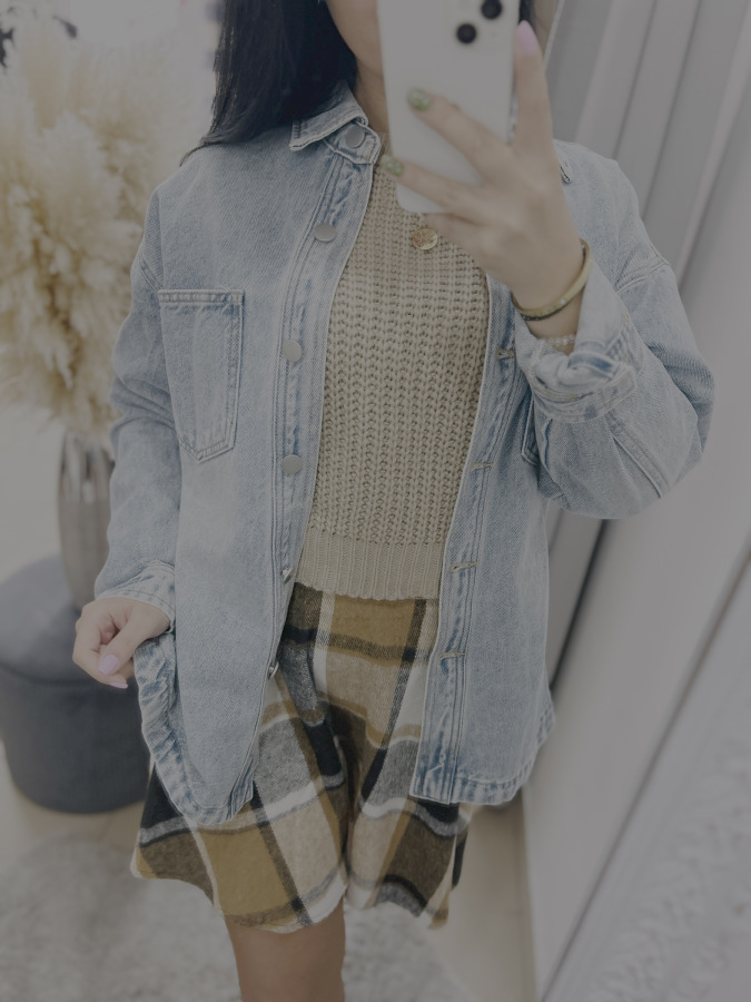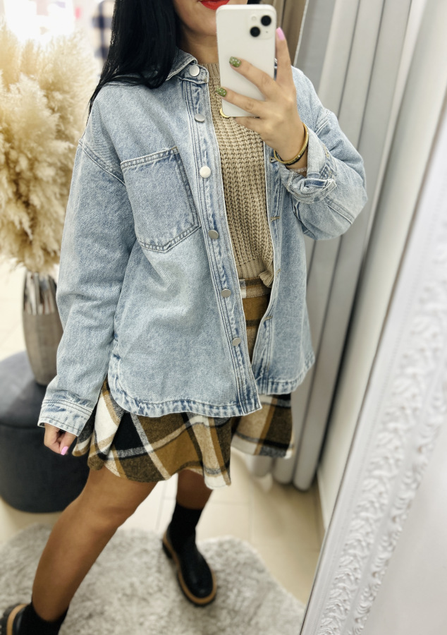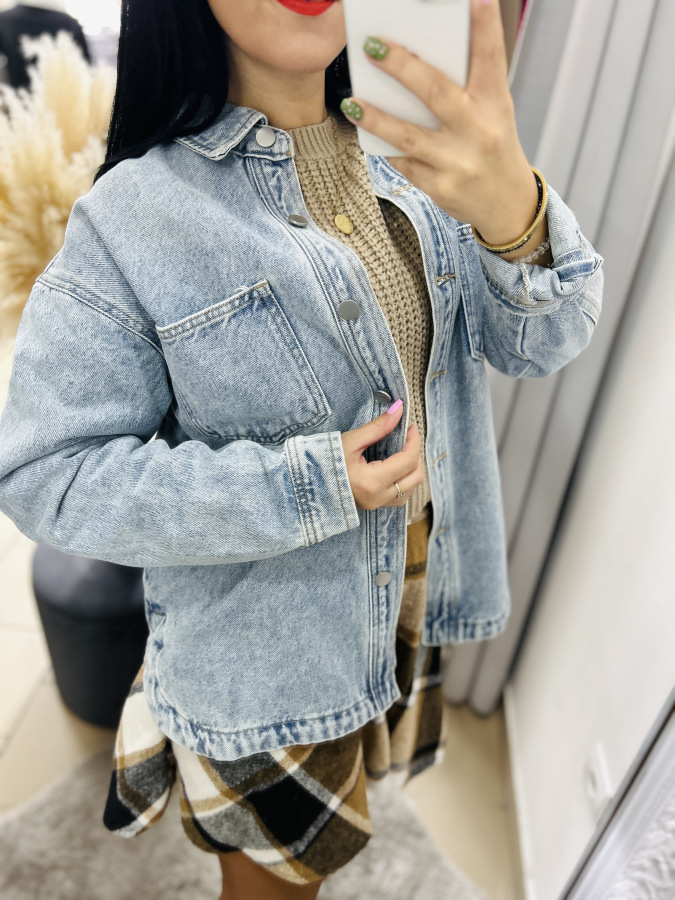 Univerzálny kúsok, ktorý by nemal chýbať v žiadnom šatníku! Táto svetlomodrá rifľová bunda v oversized strihu je ideálna na vrstvenie počas chladnejších dní. Má klasický golier, náprsné vrecko a zapínanie na kovové cvočky. Skvelo sa hodí k šatám, sukniam aj nohaviciam.
