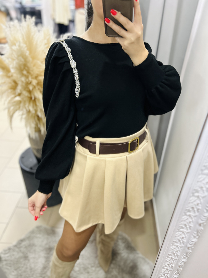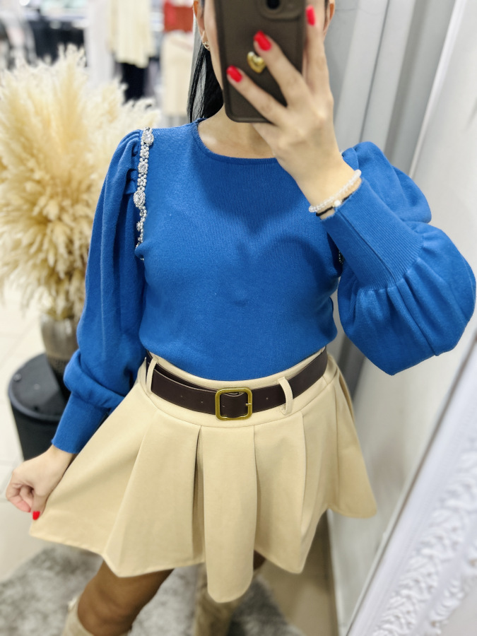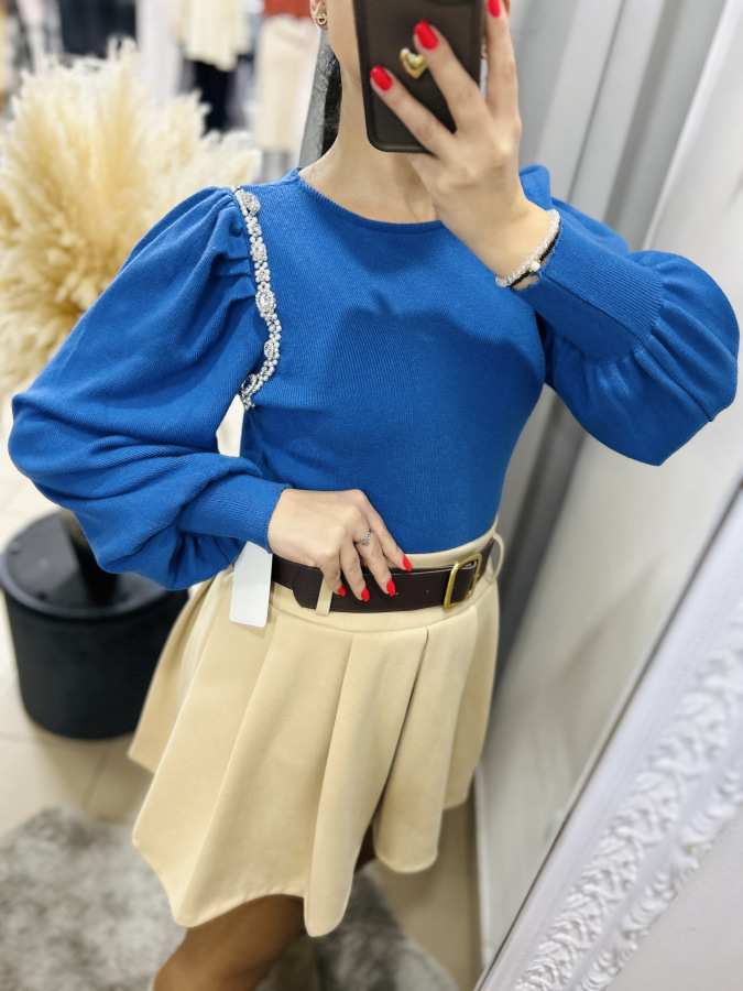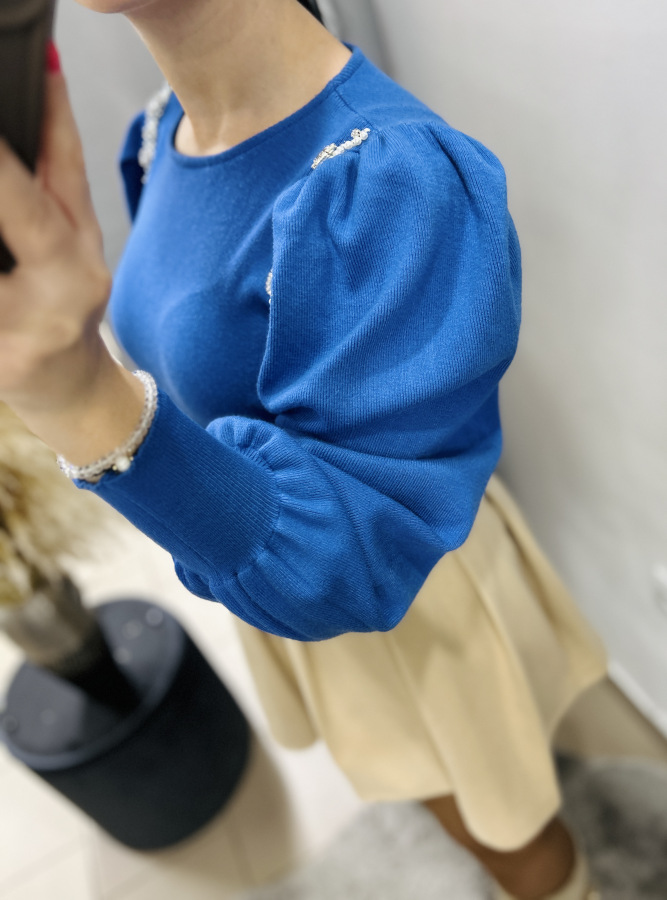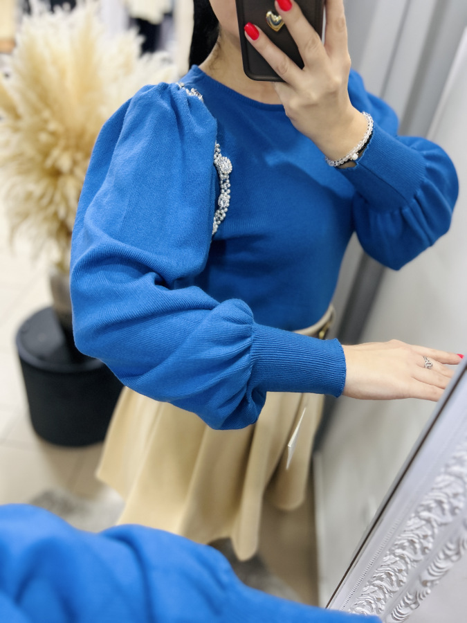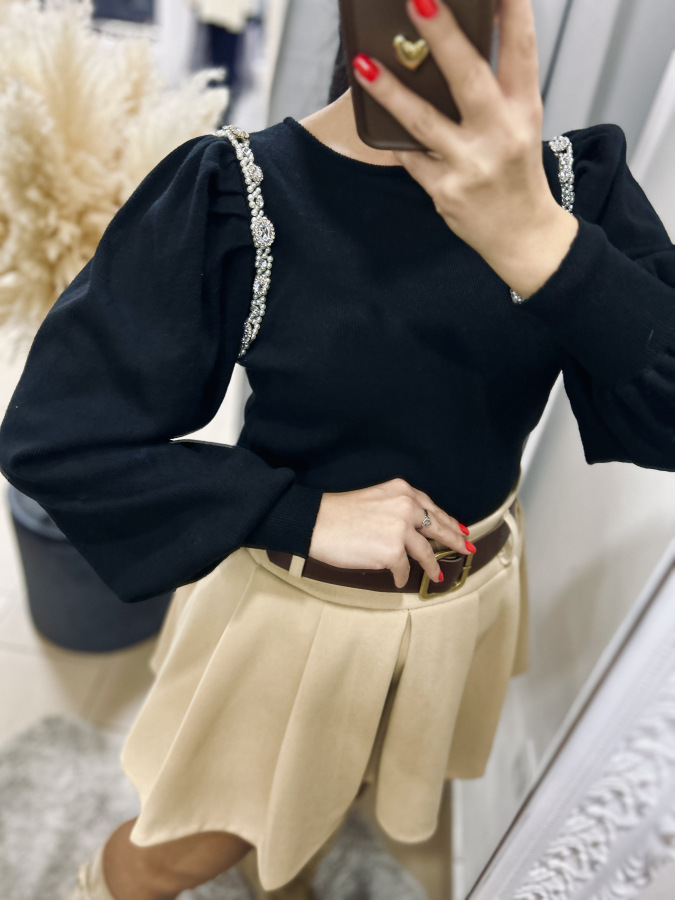Elegantný svetrík s mierne okrúhlym výstrihom a puff rukávmi. Svetrík je zdobený kamienkami a perličkami.