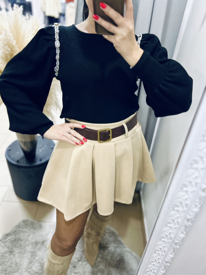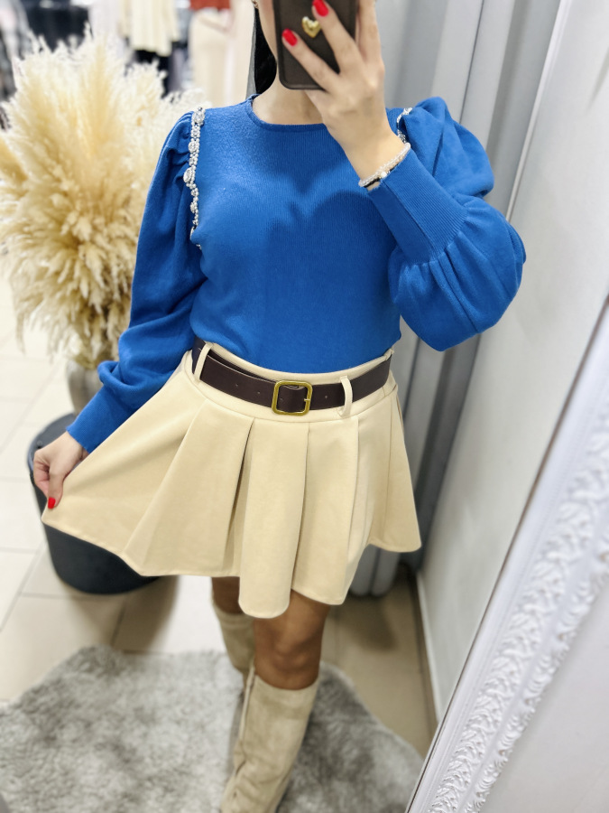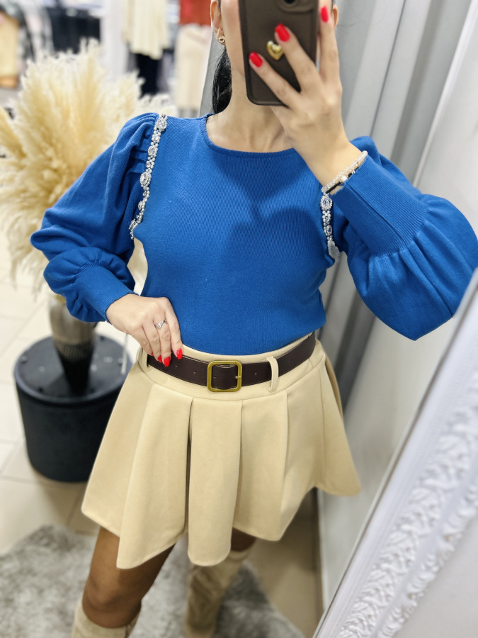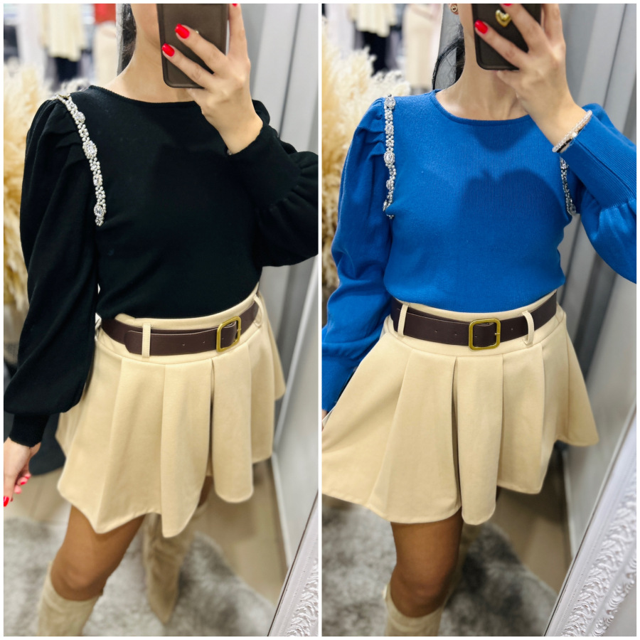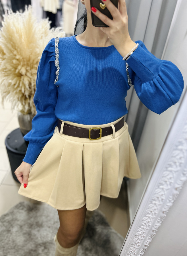Elegantný svetrík s mierne okrúhlym výstrihom a puff rukávmi. Svetrík je zdobený kamienkami a perličkami.