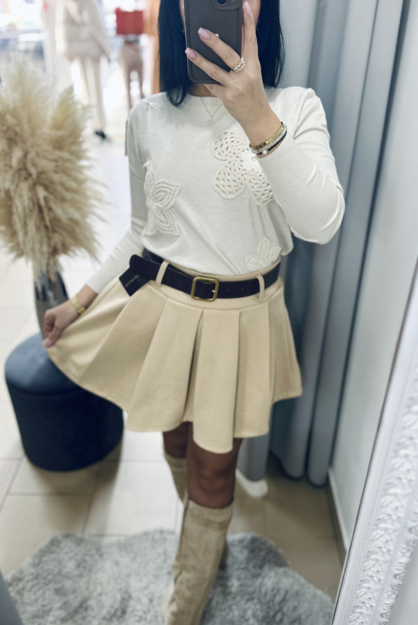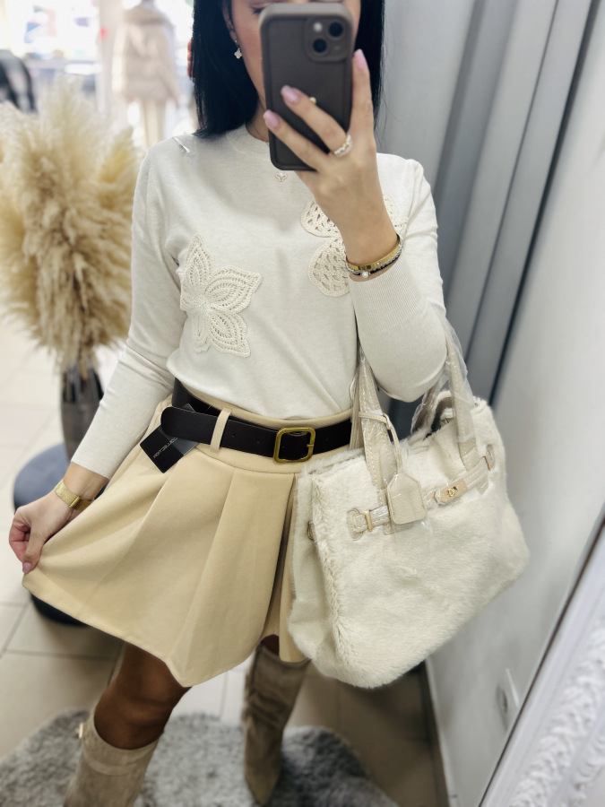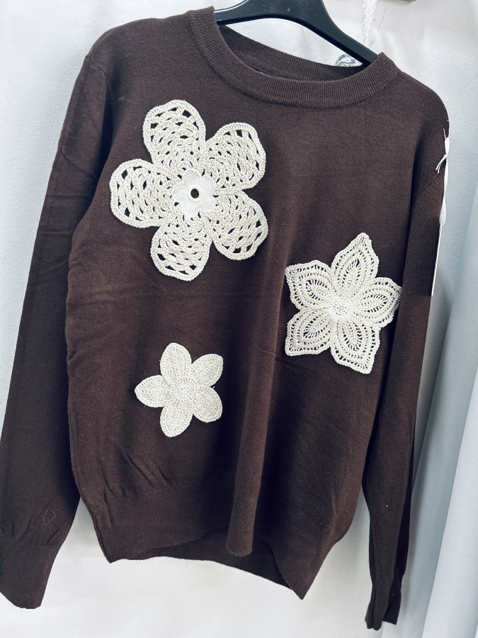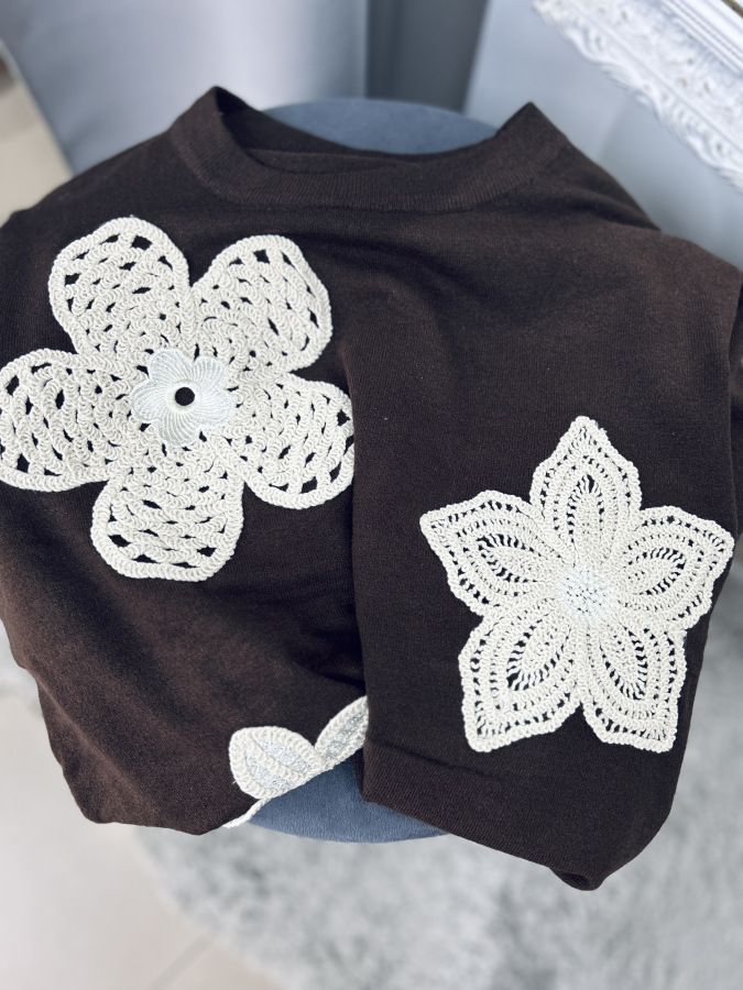 Elegantný svetrík z jemnej pleteniny, zdobený háčkováymi aplikáciami. Veľkosť UNI (sadne na veľkosti S M L menšie XL)