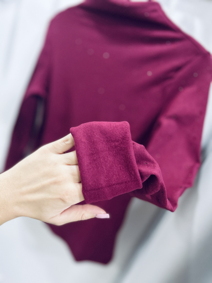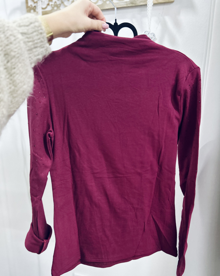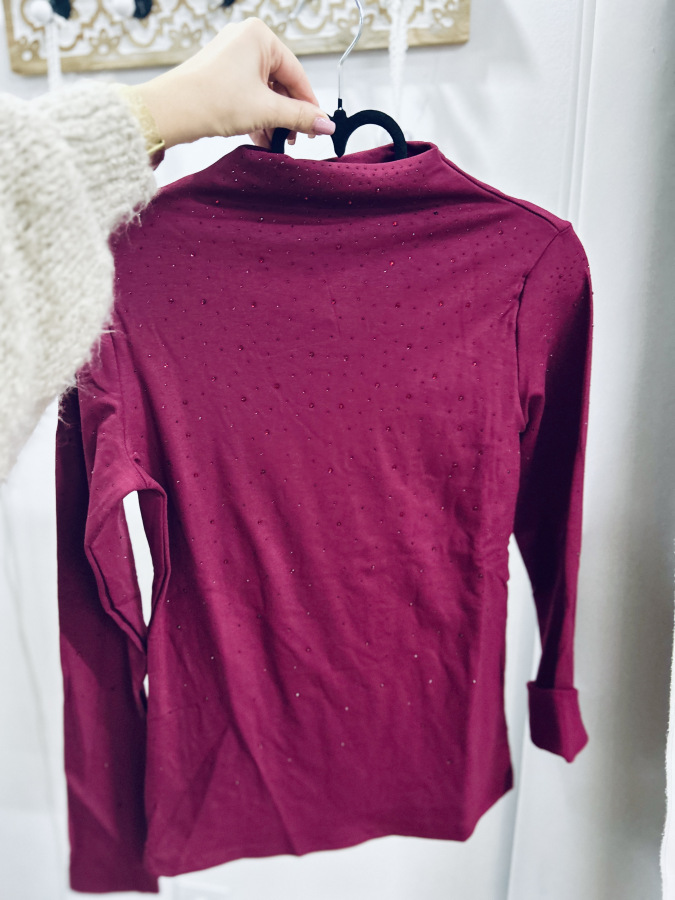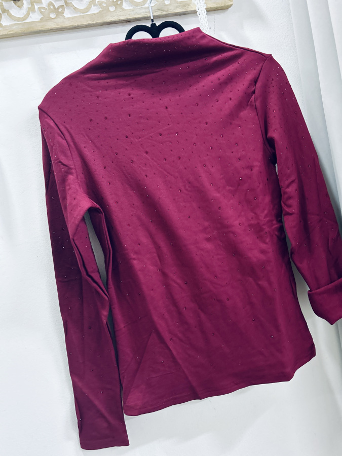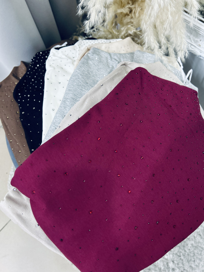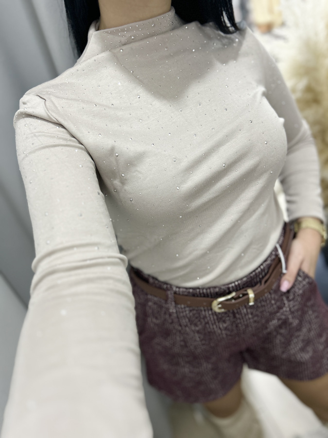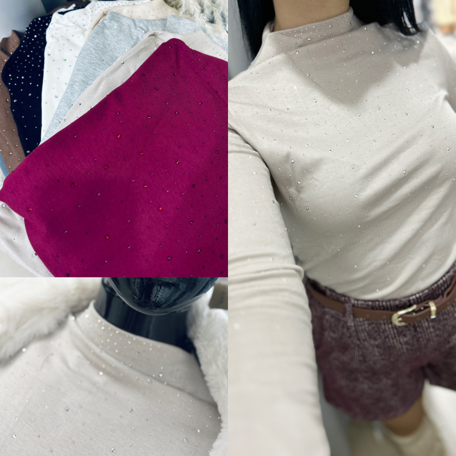 Mierne zateplený topík so stojačikom zdobený kamienkami. Top je z veľmi príjemného viskózového materiálu, je elastický.