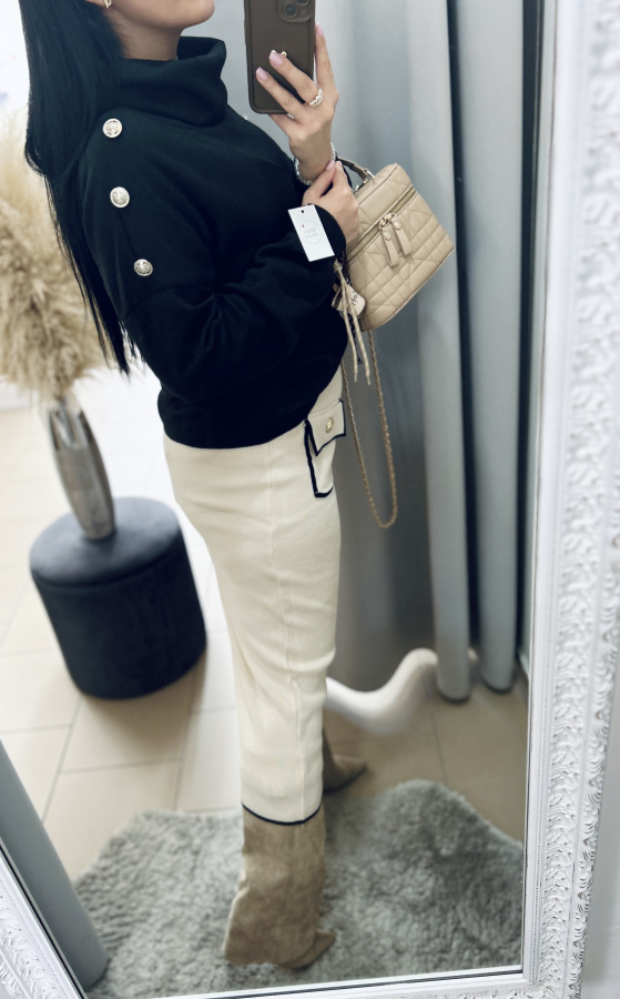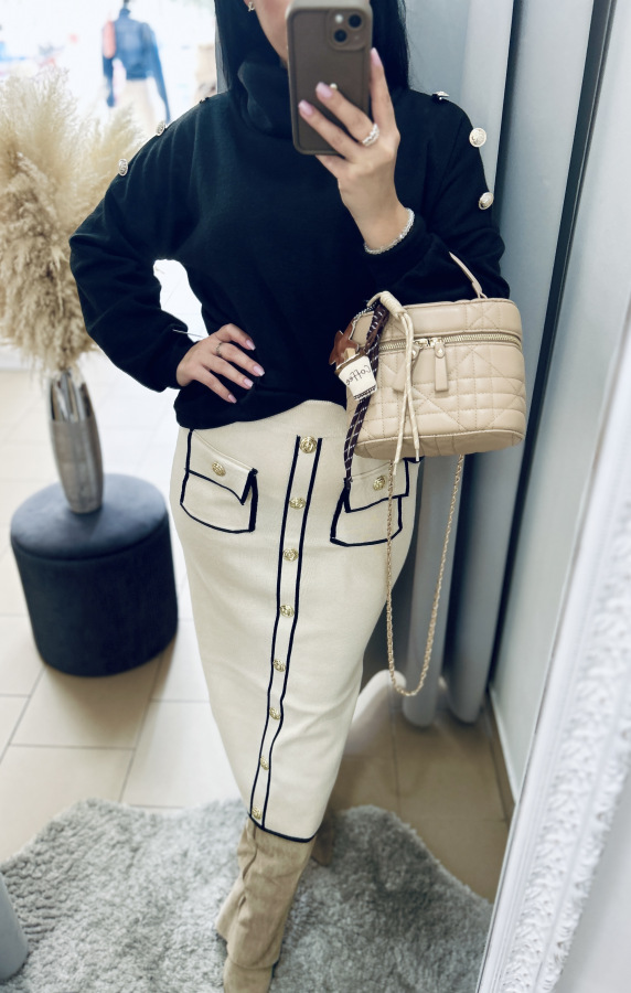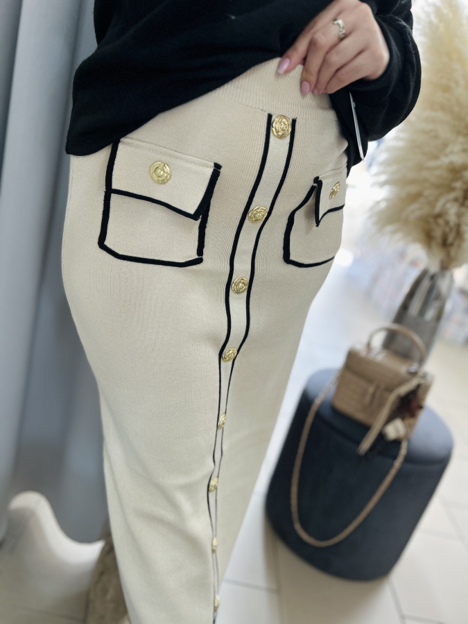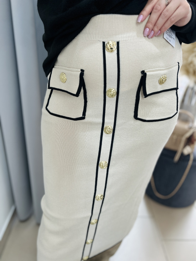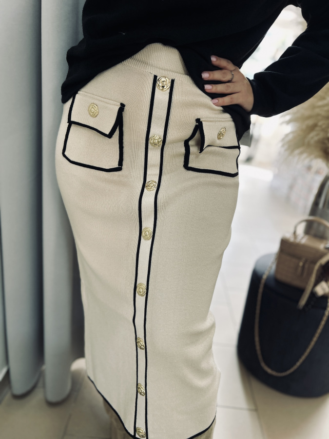 Táto štýlová pletená sukňa v béžovej farbe s čiernym lemovaním je dokonalou kombináciou elegancie a komfortu.