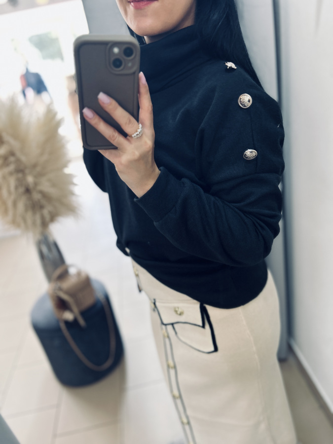 Predná časť je zdobená radom zlatých gombíkov, ktoré dodávajú modelu luxusný nádych. Dve dekoratívne vrecká s kontrastným čiernym lemom podčiarkujú moderný vzhľad. Sukňa krásne zvýrazňuje postavu a je ideálna na elegantné aj ležérne kombinácie – či už s košeľou, blúzkou alebo jednoduchým topom.