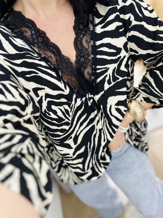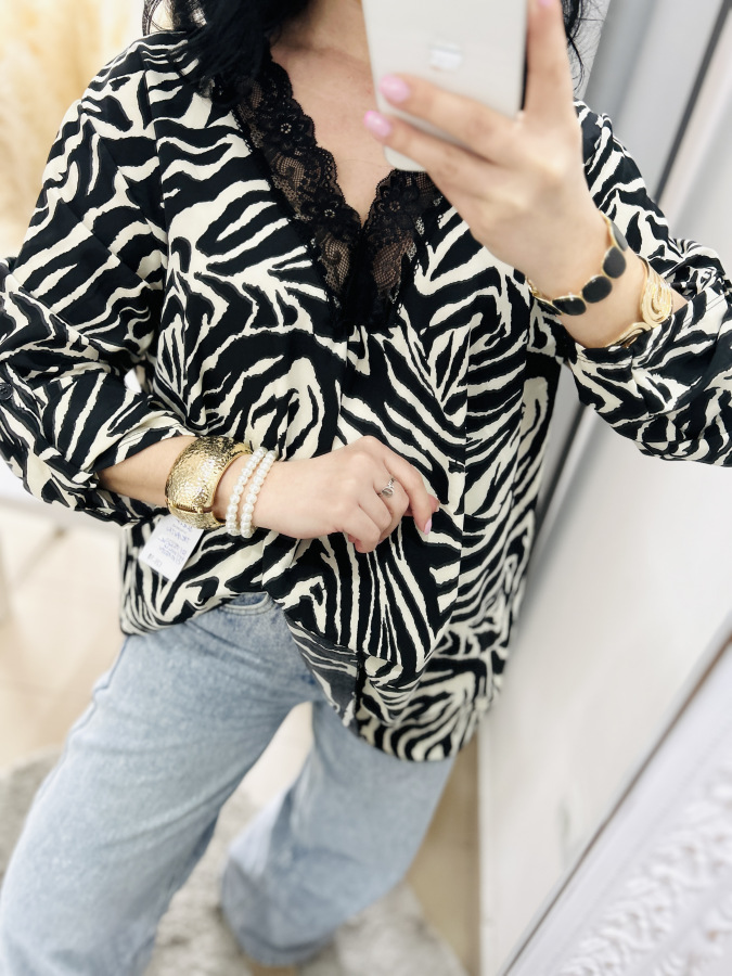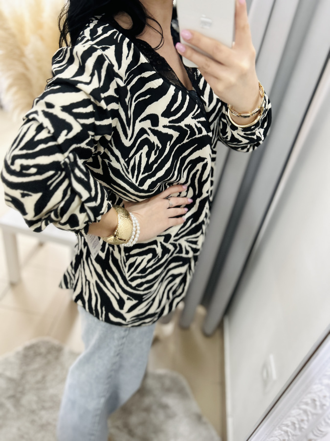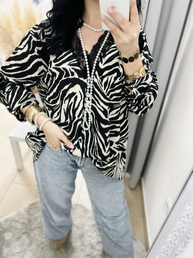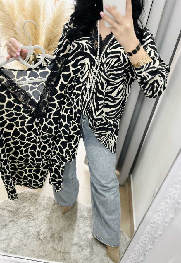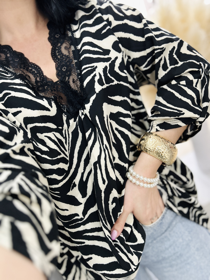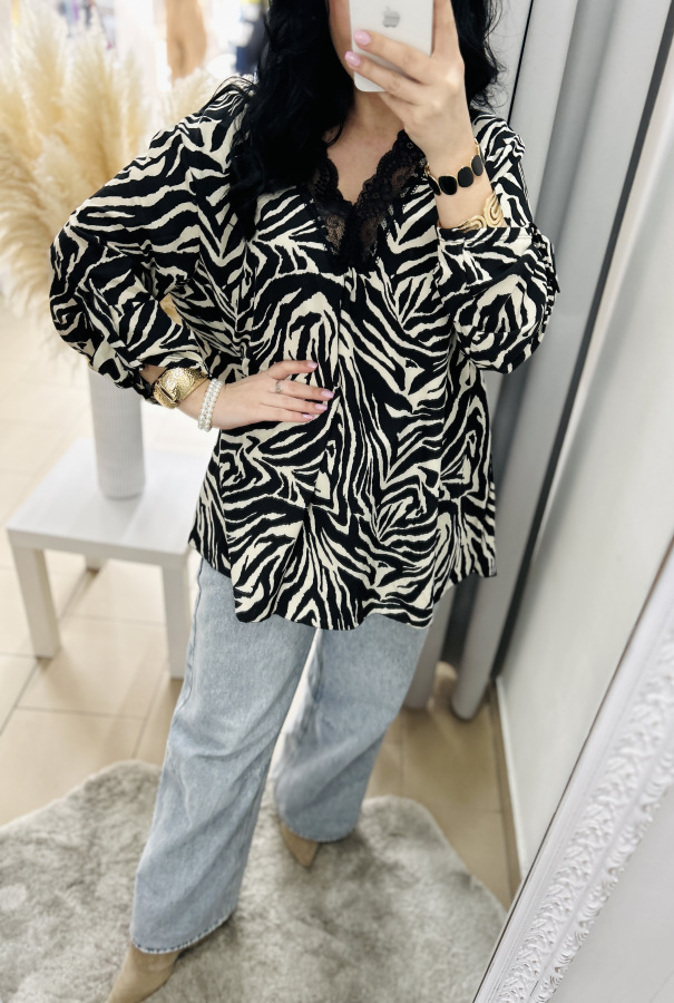 Elegantná blúzka veľkosti UNI, vhodná na veľkosti L XL XXL. Blúzka má mierny vekový výstrih zdobený krásnou čipkou a dlhé rukávy ktoré je možné skrátiť gombíkom.