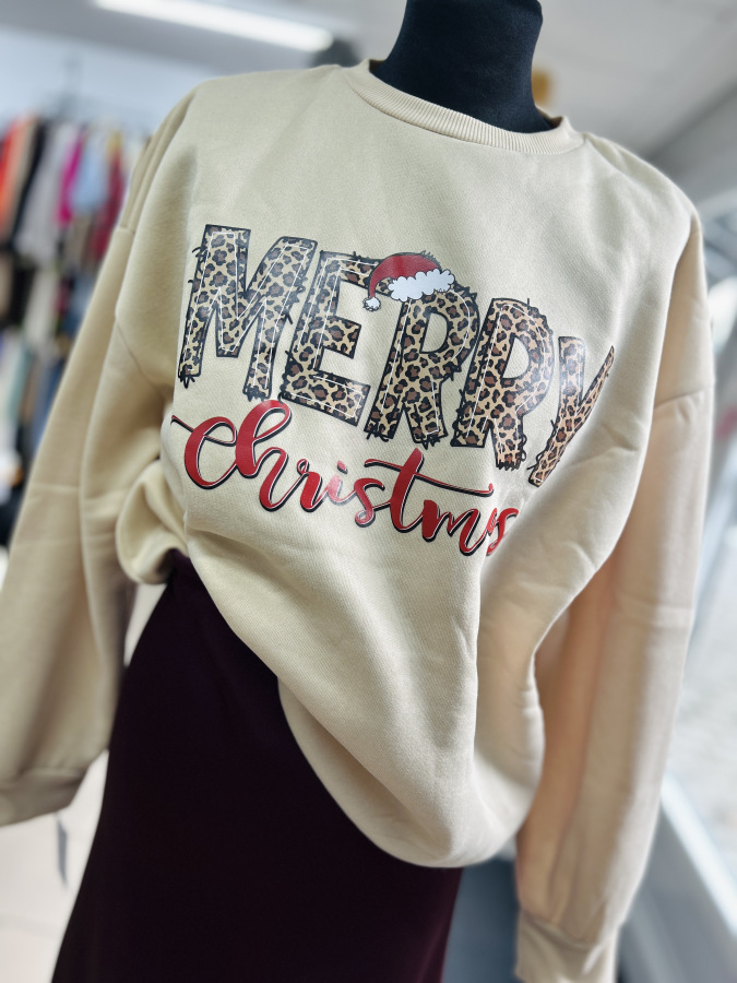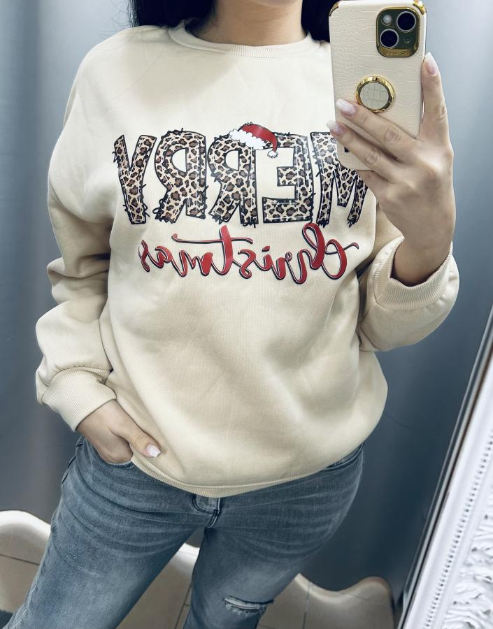 Zateplená mikina v béžovej farbe s nápisom MERRY CHRISTMAS. Veľkosť UNI (M L XL)