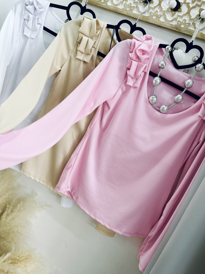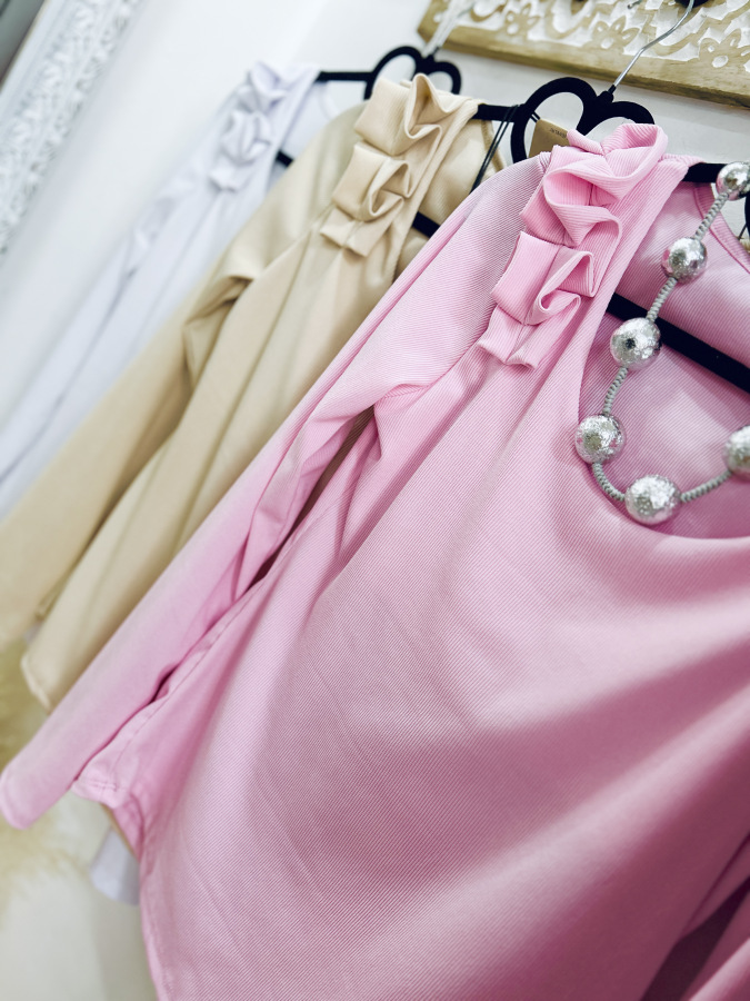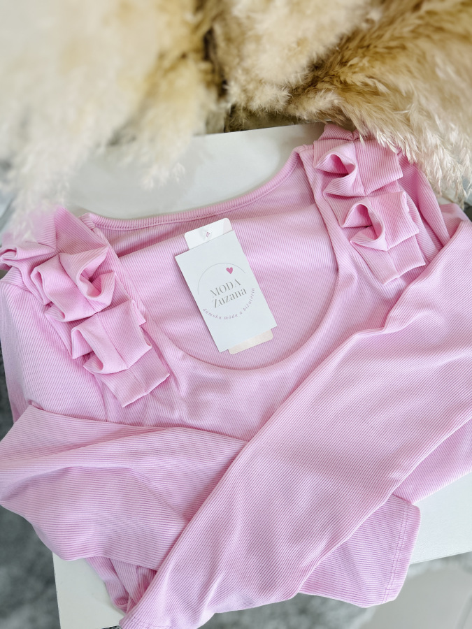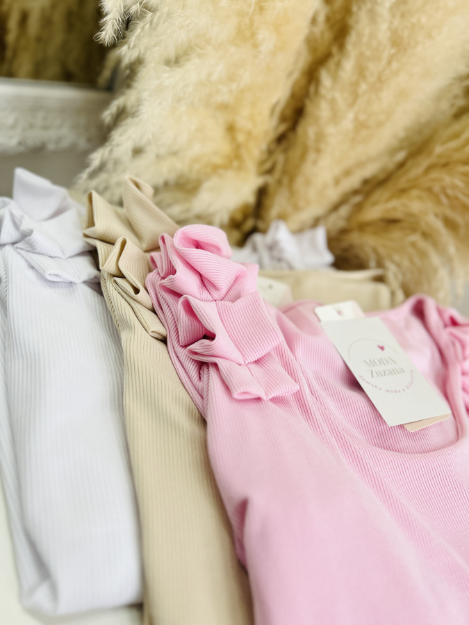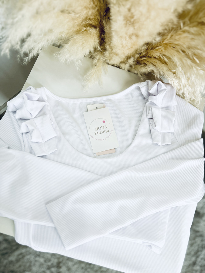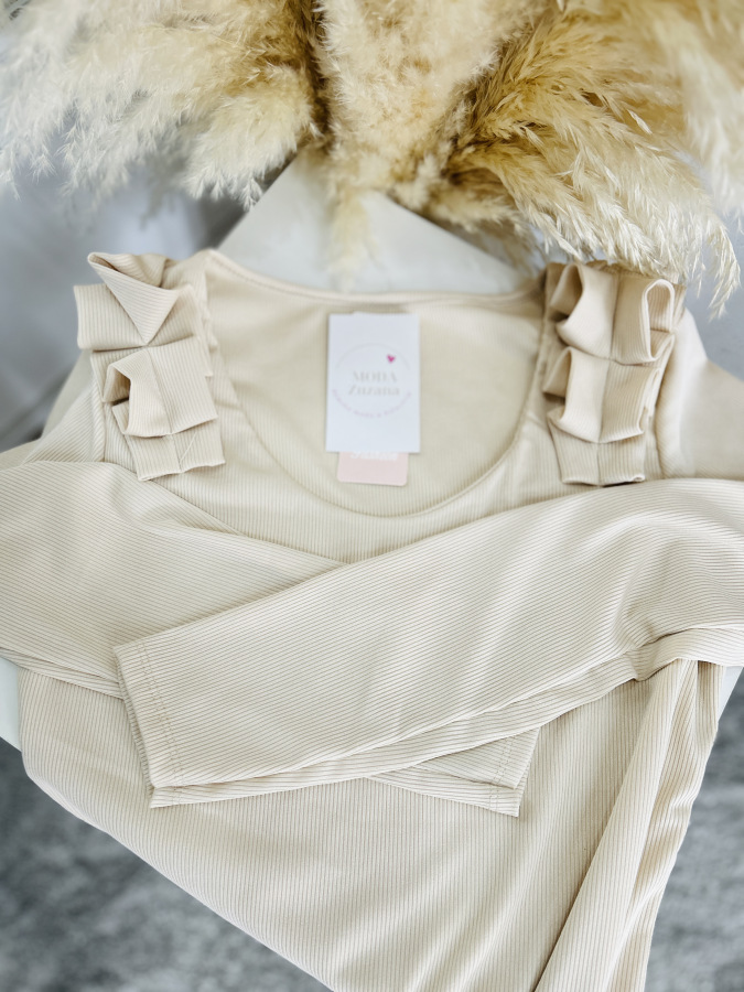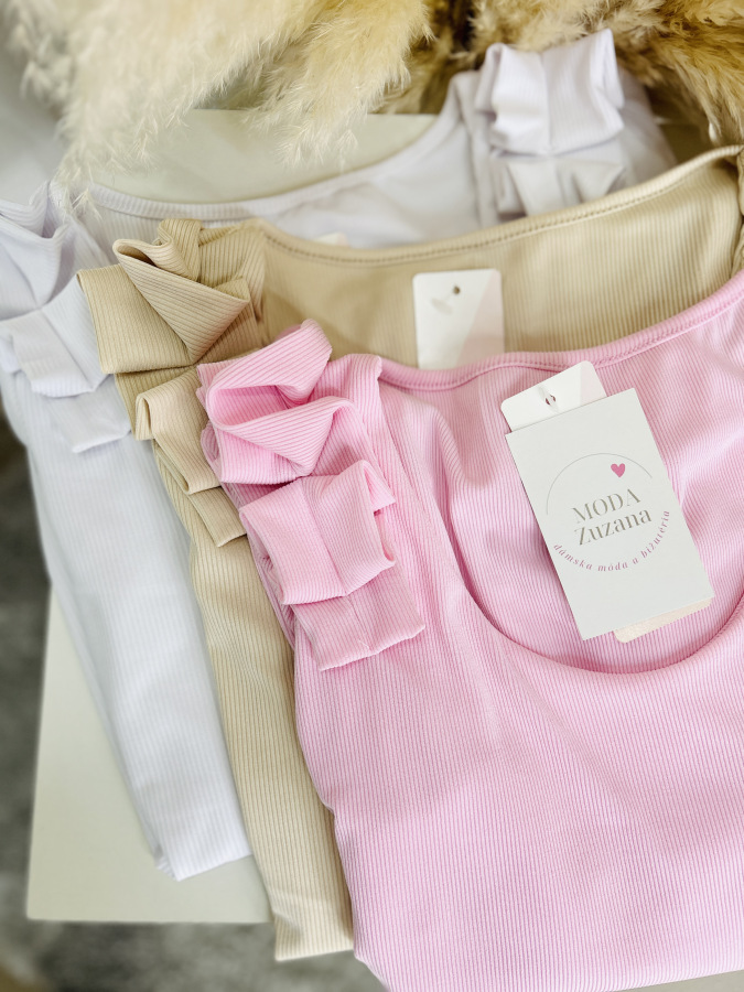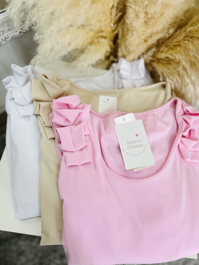Basic rebrovaný top s okrúhlym výstrihom zdobený riasením na ramenách.