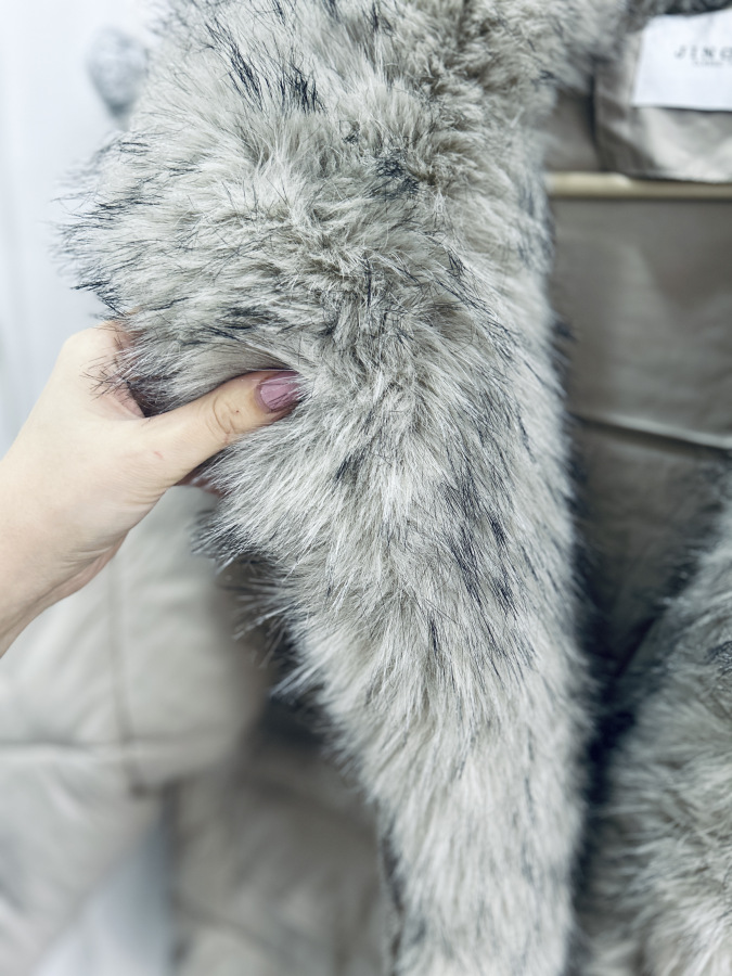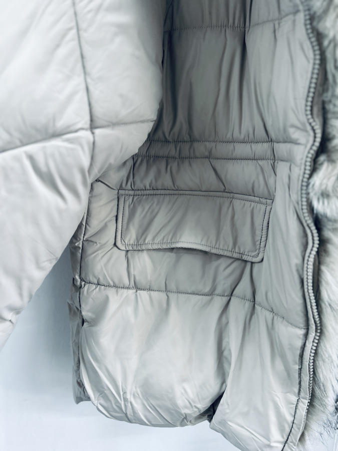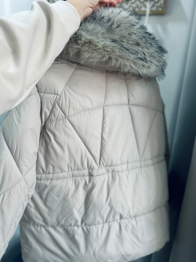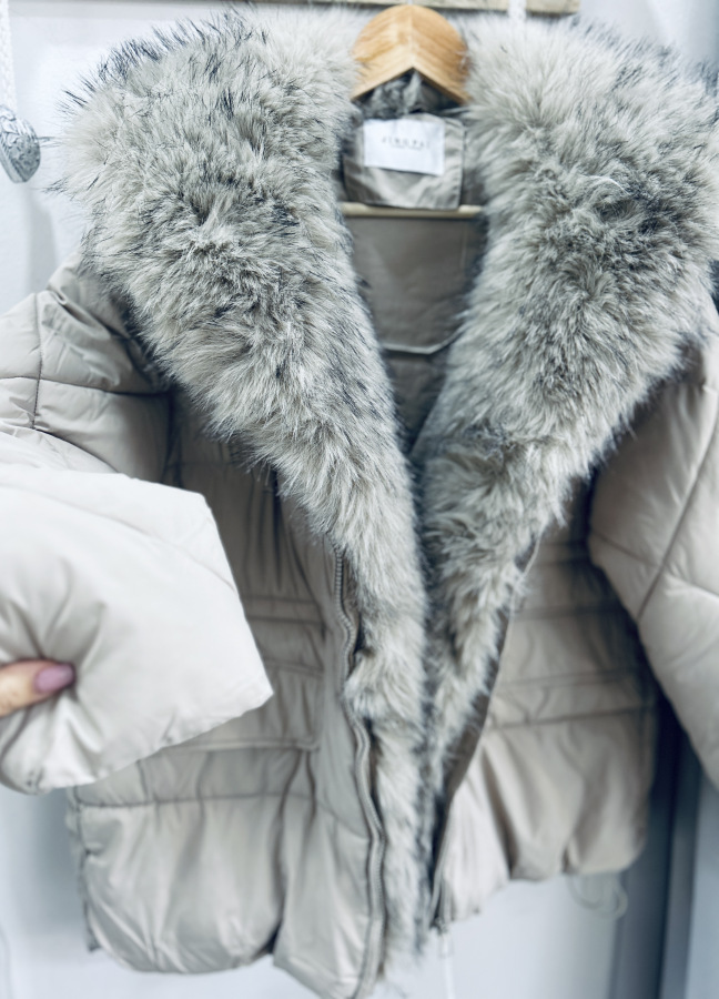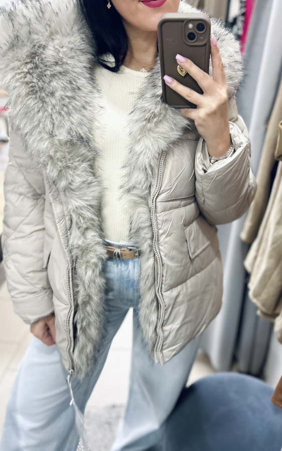 Elegantná zimná bunda v nadčasovej svetlej farbe, ideálna do chladného zimného počasia. Bunda je teplá, pohodlná a zároveň veľmi štýlová. Má luxusnú kožušinu okolo goliera, ktorá je odopínateľná, takže si ju viete prispôsobiť podľa počasia alebo outfitu.